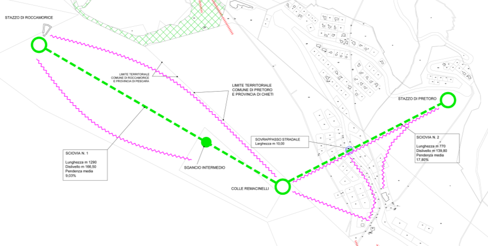 NUOVI SKY-LIFT E NUOVE PISTE. Dal punto di vista tecnico sono previste la realizzazione di due nuovi tratti di sky-lift e di nuove piste per collegare gli impianti esistenti. Il primo sky-lift va dallo stazzo di Roccamorice a Colle Remacinelli (lunghezza dell'impianto di 1.290 metri); il secondo da Colle Remacinelli allo stazzo di Pretoro (770 metri). Ci sarà anche la possibilità, per i privati, di ampliare gli impianti attualmente esistenti. Nell'immagine in allegato il tratteggiato verde indica i nuovi impianti, il viola le nuove piste da sci.
