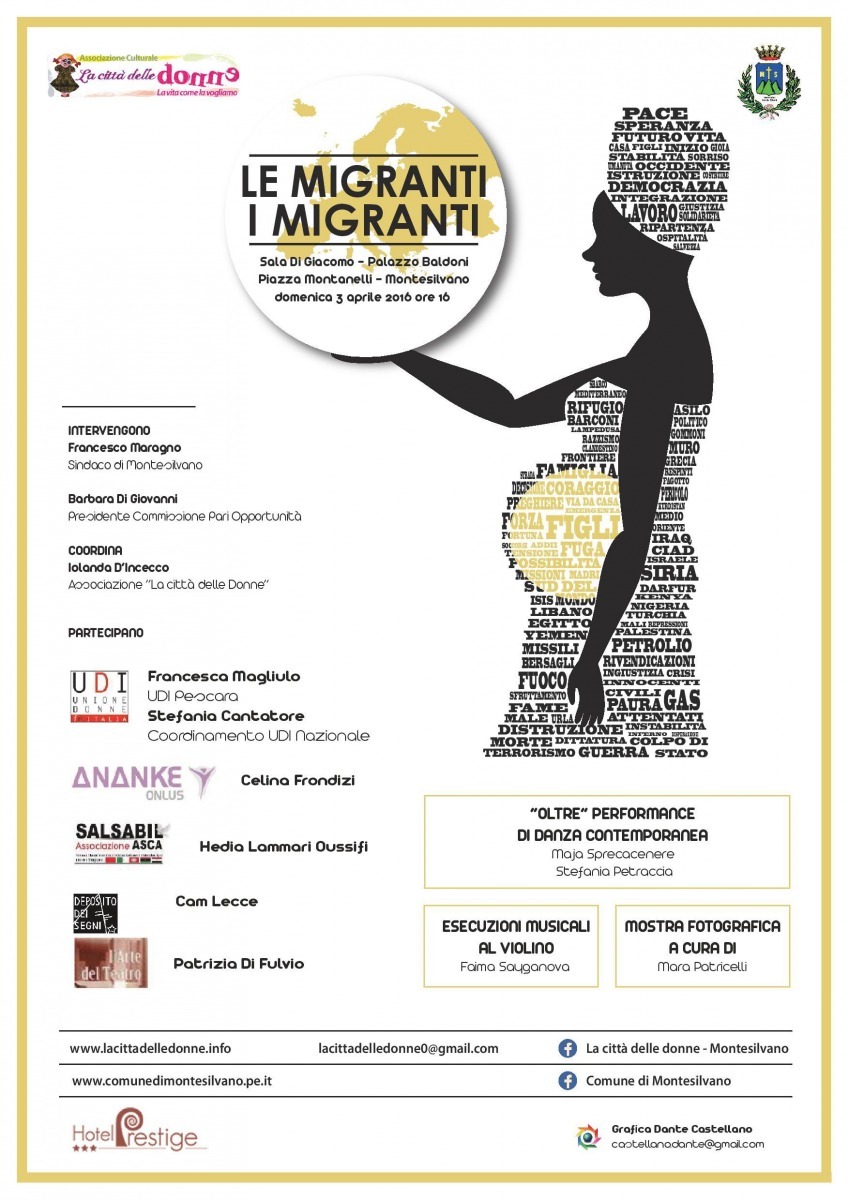 Letteratura, danza, musica, poesia. Sarà l’arte a tutto tondo a caratterizzare l’incontro pubblico che si terrà domenica 3 aprile, nella sala Di Giacomo di Palazzo Baldoni a Montesilvano a partire dalle 16. L’appuntamento, dal titolo “Le migranti, I migranti”, è organizzato dall’associazione “La città delle donne” per riflettere sull’attualissimo tema della migrazione, analizzato e raccontato da un punto di vista femminile con il contributo delle associazioni di donne che operano da alcuni anni sul territorio e che porteranno la loro esperienza sulle modalità di integrazione delle migranti e dei migranti nei centri urbani e interni.