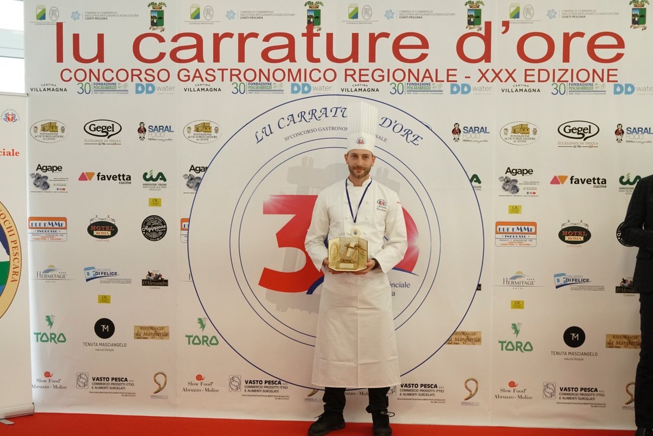 2) Il secondo posto, “Lu Carrature d’Argento”, è andato a Stefano del Vescovo, 21 anni di Mosciano S. Angelo e sous chef del ristorante Borgo Fonte Scura di Silvi per il piatto “Tortello di ricotta e scampi con salsa al cappone”, un piatto innovativo che ha meritato anche il premio speciale “Gegel all’estetica del piatto”.