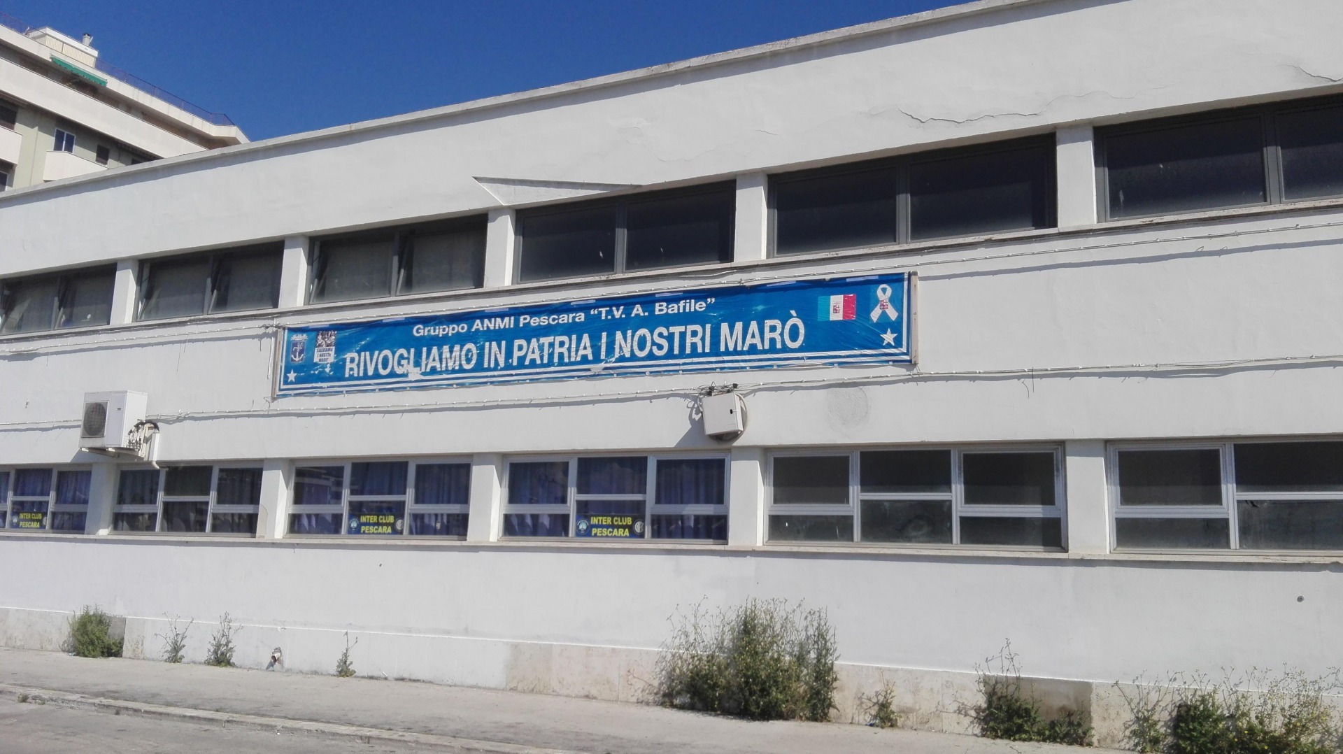 Spinti dall’emozione per la sorte dei nostri connazionali, rappresentanti in divisa dell’Italia, gli associati del Gruppo di Pescara dell’ANMI, intitolato alla Medaglia d’Oro al Valor Militare T.V. Andrea Bafile, del Reggimento San Marco, avevano fatto apporre all’esterno della Sede del Gruppo uno striscione recante la scritta “Rivogliamo in patria i nostri Marò”.