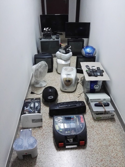 In quel luogo, infatti, c'era di tutto: sei televisori LCD di varie marche, 11 telefoni cellulari, di cui tre smartphone, elettrodomestici vari (spremiagrumi, ferro da stiro a vapore, robot da cucina), due radiotrasmittenti, due apparati stereo musicali, numerosi hard disk e altro ancora.