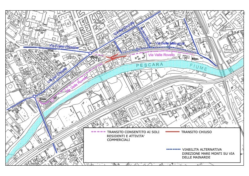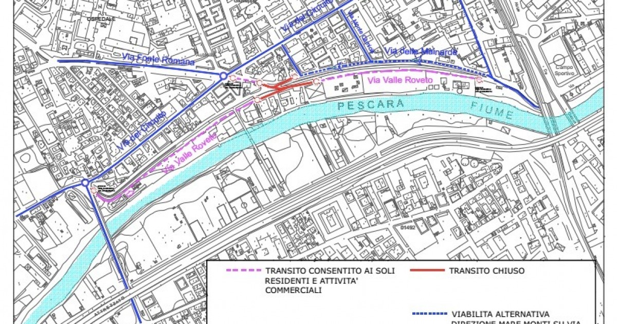 VIA ROVETO, DISAGI AL TRAFFICO AUTO PER APERTURA CANTIERE PONTE NUOVO. A partire da lunedì 4 agosto verranno eseguiti dei lavori di adeguamento di un tratto di via Valle Roveto per adeguare la struttura dell'argine fluviale propedeutica all'apertura del cantiere Ponte Nuovo, la stuttura in ferro dal costo di 18 milioni di euro che collegherà la zona sud con la zona nord di Pescara.