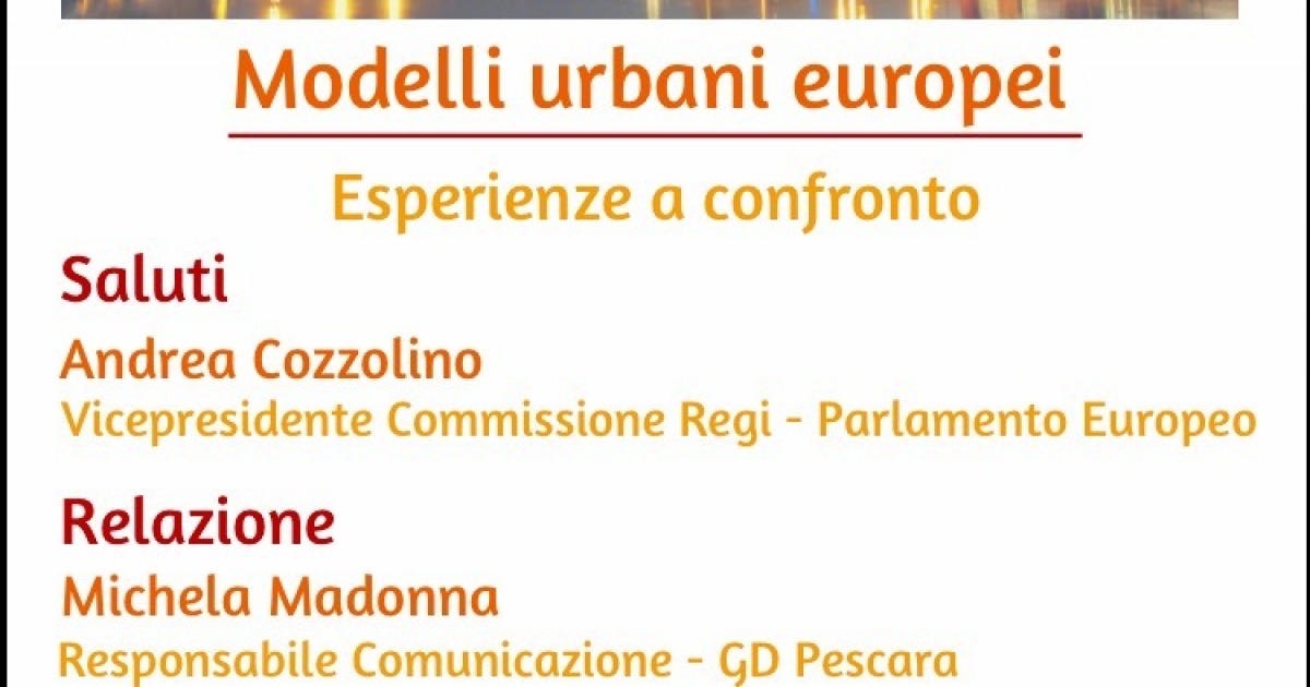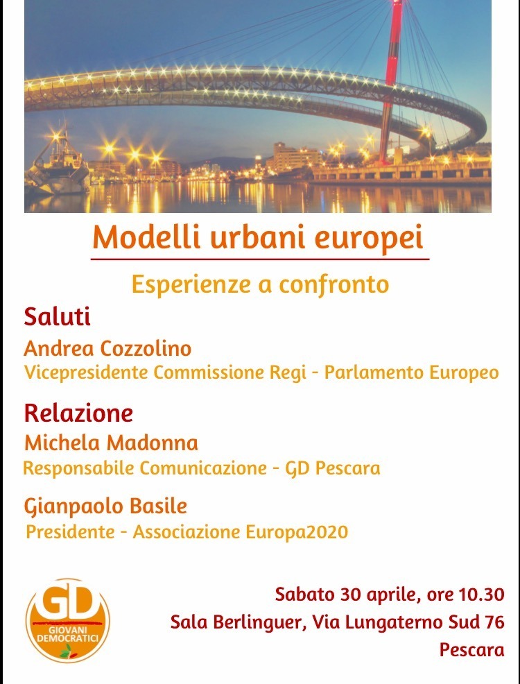 COZZOLINO A PESCARA. Sabato 30 aprile a Pescara, alle ore 10:30 presso la Sala Berlinguer della Fondazione Abruzzo Riforme, in via Lungaterno Sud 76, avrà luogo l'iniziativa dal titolo "Modelli urbani europei: esperienze a confronto".