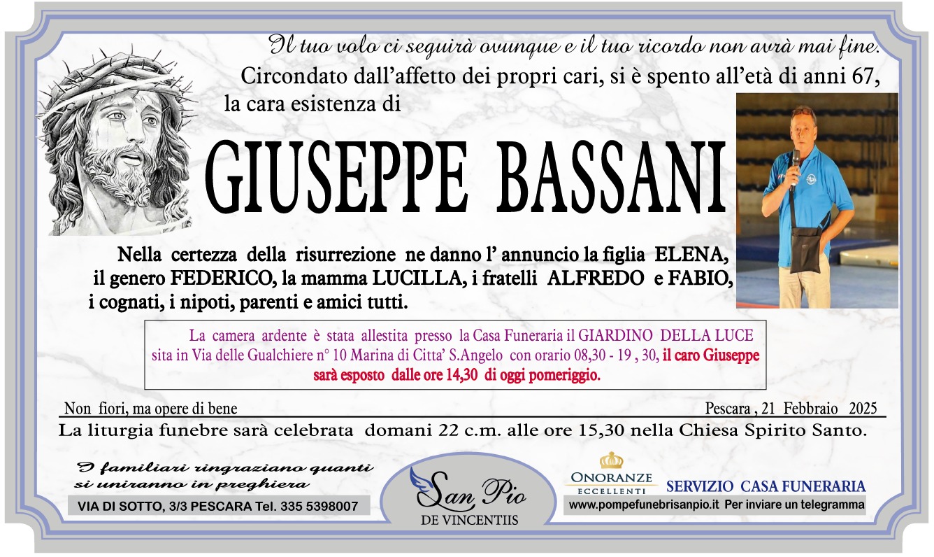 Il mondo della ginnastica abruzzese è in lutto per la scomparsa, all'età di 67 anni di Giuseppe Bassano, presidente dell'ASD Ginnastica Pescarese e vice presidente FGI Abruzzo. Da tempo malato si è spento questa mattina della sua abitazione, nel centro di Pescara.
