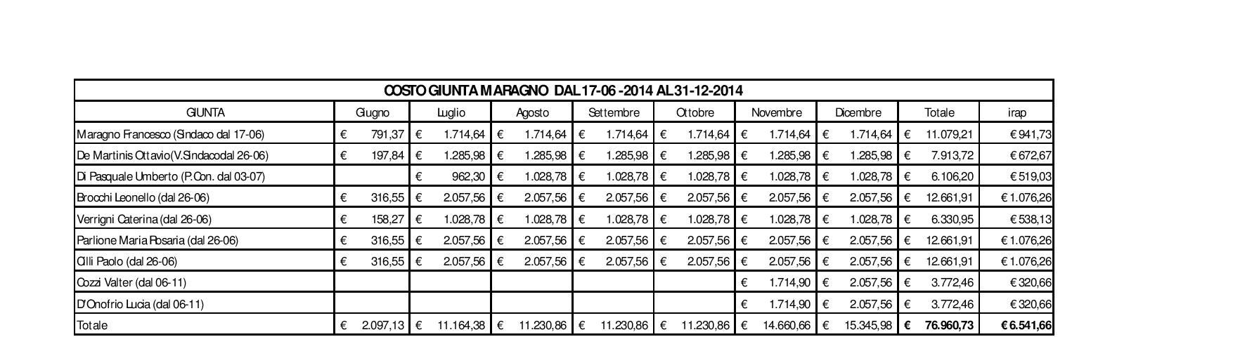 INDENNITA' DI CARICA. Altre spese analizzate sono quelle per la corresponsione delle indennità di carica ai componenti della Giunta e al presidente del Consiglio comunale, nel periodo giugno-dicembre 2014 e nel periodo giugno-dicembre 2013. La spesa sostenuta per il sindaco Di Mattia, gli 8 assessori della sua Giunta, e il presidente del Consiglio Comunale ha raggiunto un totale di 129.739 €. Di contro la Giunta Maragno, da giugno a dicembre 2014 è costata alle casse del Comune di Montesilvano, 76.960 €, con un risparmio di 52.779€.