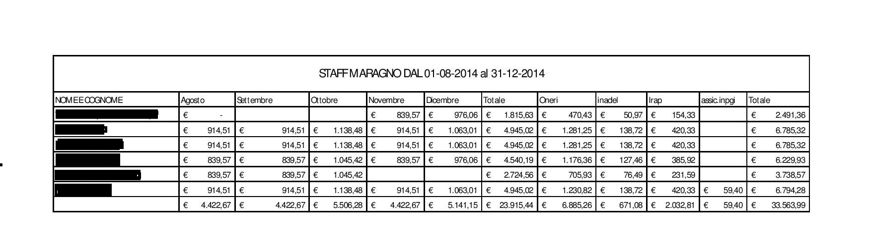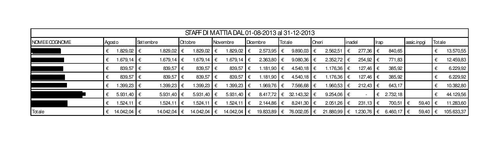 CAPITOLO STAFF. Primo punto messo in evidenza sono le spese sostenute dall’Amministrazione in carica per le assunzioni dello staff del sindaco, nel periodo agosto-dicembre 2014, raffrontandole con quelle della precedente Amministrazione, nello stesso periodo ma nel 2013. Ciò che emerso con chiarezza è il risparmio, in soli 5 mesi di ben 72.070 €. L’attuale Giunta ha, infatti, conferito 5 incarichi, per un totale di 33.563,99 €. La Giunta Di Mattia, invece, ha conferito 7 incarichi, tra i quali si include il Capo di Gabinetto a cui sono stati dati da agosto a dicembre 2013 44.129 €, per una spesa complessiva di 105.633,37€.
