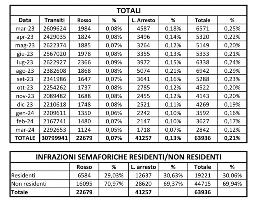 Dall'analisi dei dati raccolti a Palazzo di città, infatti, emerge che in totale i transiti sotto agli impianti semaforici in questione sono stati pari a 30.799.941 per cui se si rapportano le infrazioni accertate al numero dei transiti complessivi, emerge che è stato sanzionato, in media, lo 0,21% dei transiti registrati, equivalente a una violazione accertata ogni 481 veicoli transitati.