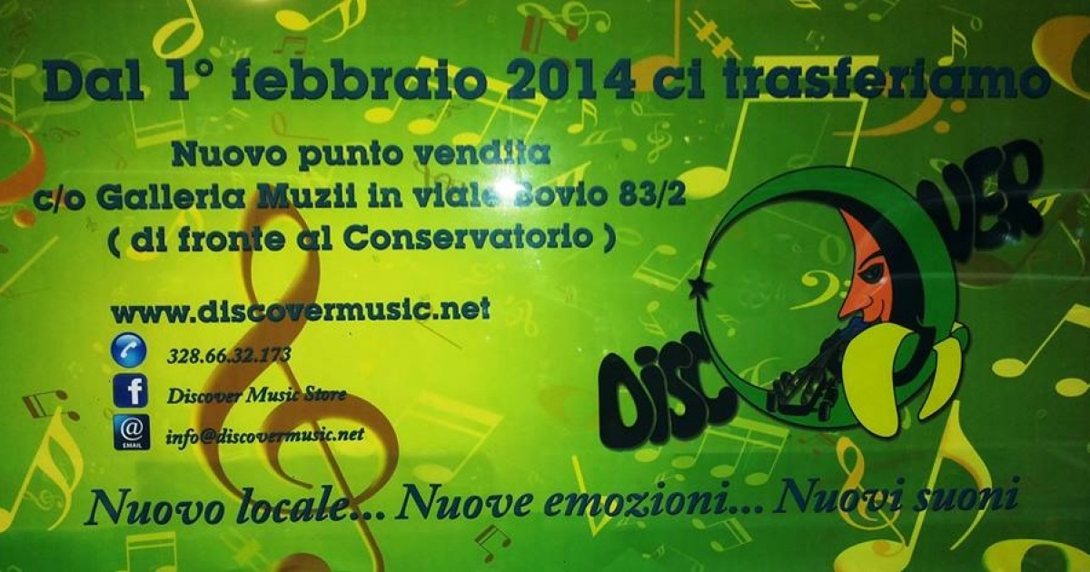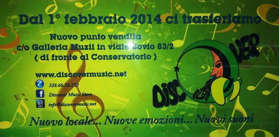 INAUGURA IL NUOVO PUNTO VENDITA DISCOVER. La storica attività Discover, impegnata da quasi quarant’anni nella diffusione della cultura musicale, cambia location e si trasferisce presso la Galleria Muzii in Viale Bovio 83/2 a Pescara. Per festeggiare il lieto evento Sabato 1 Febbraio dalle ore 16:00 ci sarà l’inaugurazione ufficiale a seguire alle ore 18:00 il live di Gae Campana che presenterà il suo nuovo album. Il trasferimento costituisce un nuovo inizio per un negozio che "resiste" alla crisi e al download illegale, offrendo oltre trentamila articoli tra CD, DVD, BLU RAY, LP.