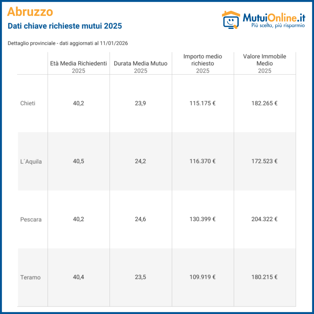 Analizzando i dati provinciali relativi all’Abruzzo, nel 2025 Pescararisulta la provincia dove i richiedenti di mutuo sono i più giovani della regione (40 anni e 3 mesi in media), mentre a L’Aquila l’età media registrata è la più alta (40 anni e 6 mesi). Nella provincia di Pescara, inoltre, vengono concessi i mutui più lunghi di tutta la regione, con il dato che tocca i 24 anni e 7 mesi nel 2025, con i più brevi che si registrano invece a Teramo (23 anni e 6 mesi in media).Guardando l’importo medio richiesto, anche in questo caso Pescara si trova in cima alla classifica con un dato di 130.399 €, mentre la provincia di Teramo è quella dove si chiedono le somme minori, pari a 109.919 € in media nel 2025. Guardando ai dati riguardo il valore medio degli immobili, Pescara conquista nuovamente il primo postonella regione con 204.322 €, mentre a L’aquila si trovano quelli meno cari con 172.523 € in media.