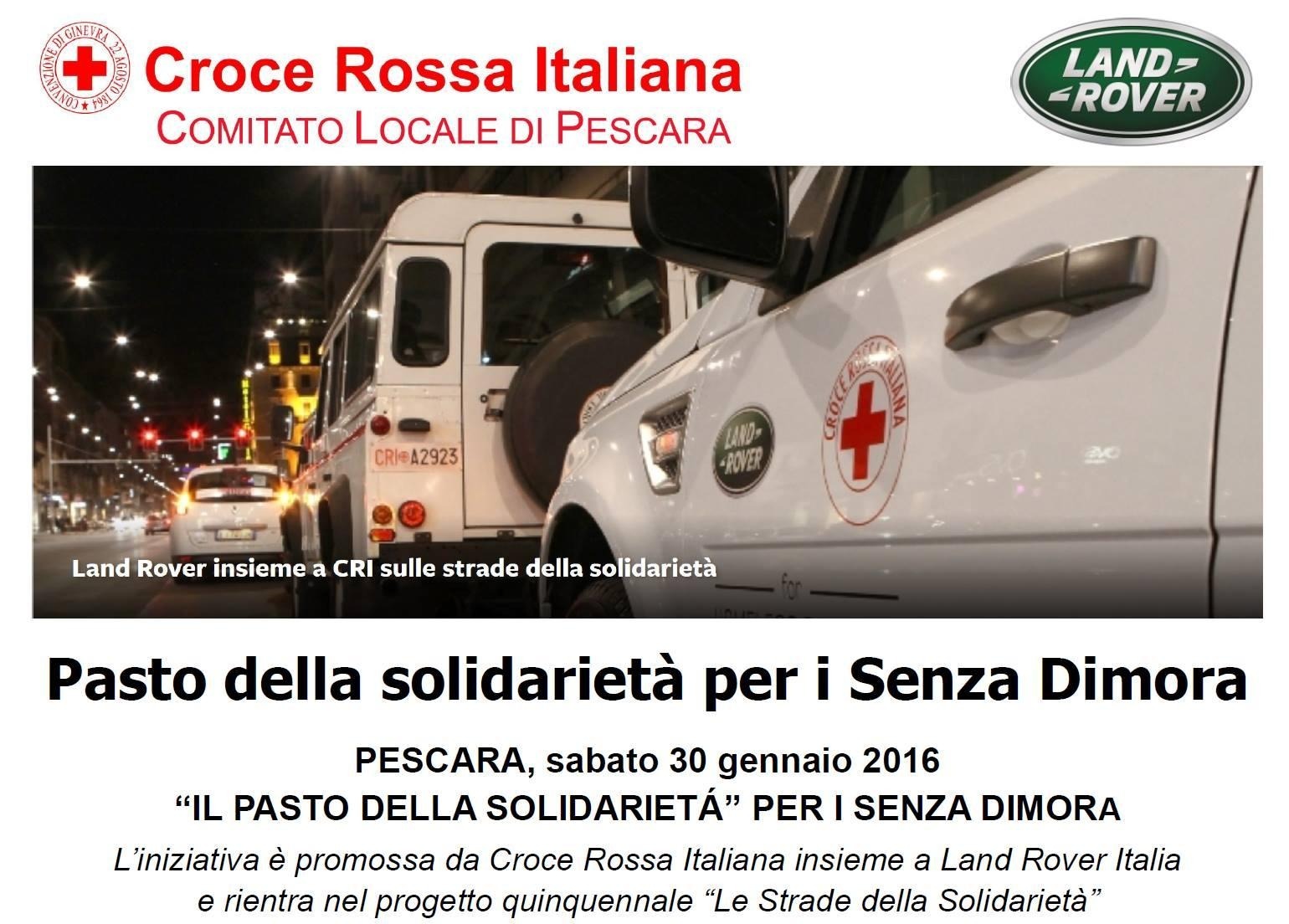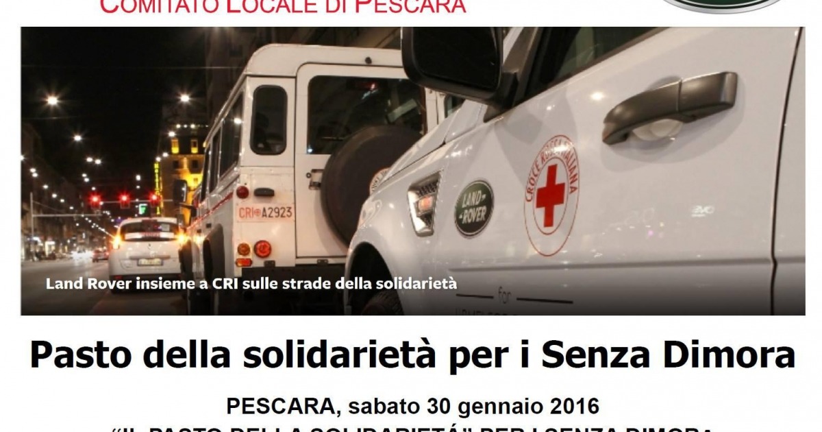 UN PASTO UNA TANTUM. Si chiama “Pasto della Solidarietà” la cena che avrà luogo sabato 30 gennaio a Pescara e in altre 24 città d’Italia, promossa in Italia da CRI e Land Rover. Per la città è un ritorno dopo diversi anni di assenza: l’evento, patrocinato dal Comune di Pescara, è reso possibile grazie al supporto delle Unità di Strada che ogni giorno operano a favore dei più bisognosi in rete con le altre associazioni che si occupano di assistenza alle persone senza fissa dimora.