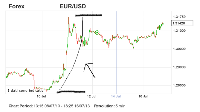 I tassi sono scesi e il dollaro si è di nuovo deprezzato, il dollar index è sceso, il cambio euro dollaro è salito di quattro figure in poche ore! Come dicevo nell’articolo del 10 luglio, mi sembrava alquanto esagerata la reazione dei mercati alle parole di Bernanke nell’ultima riunione della Fed di giugno. Eccessiva la correzione che si era avuta in maniera generalizzata su tutte le asset class e sui tassi americani; tassi al rialzo, che in maniera ribadisco esagerata, scontavano già una ripresa dell’economia particolarmente positiva e consolidata. Il QE quindi continua, si continua a stampare moneta e ancora nuova liquidità viene immessa nel mercato; il malato (l’economia reale) continua ad essere drogato. Continuerà, fino a quando, ma soprattutto servirà? Per ora quindi “ buy on dips ” …le correzioni vanno comprate. L’indice americano SP500, vero benchmark delle borse mondiali, è sempre impostato al rialzo e il trend di lungo termine rimane positivo.
