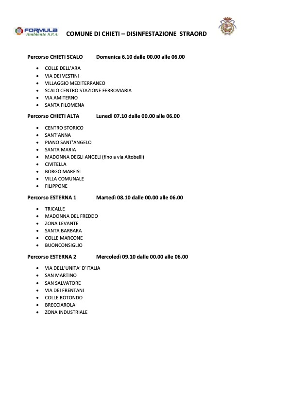 La disinfestazione avrà luogo da sabato notte secondo la seguente divisione in zone: