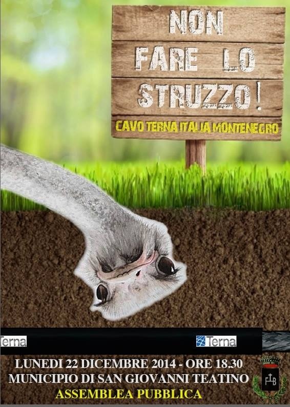 MARINUCCI CHIAMA TUTTI A RACCOLTA. Lo slogan è di quelli ad effetto: "Non fare lo struzzo". Con queste premesse oggi pomeriggio, alle ore 18.30 nella sala consiliare del Comune di San Giovanni Teatino, si terrà un’assemblea pubblica contro il cavidotto Pescara-Tivat, impianto che andrà poi a collegarsi al costruendo elettrodotto Villanova-Gissi. All'incontro, aperto a tutti, prenderà parte anche il sindaco Luciano Marinucci, che si è da tempo schierato contro l'opera della società Terna. In una lettera ai suoi concittadini, Marinucci afferma: