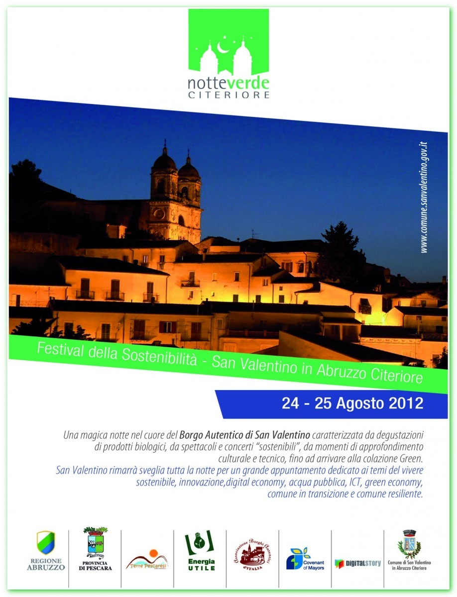 NOTTE VERDE A SAN VALENTINO. Sarà presentato domani, martedì 21 agosto, alle ore 10.30, nella sala Figlia di Jorio della Provincia di Pescara, il Festival della sostenibilità in programma la notte tra il 24 e il 25 agosto 2012 a San Valentino in Abruzzo Citeriore. Il programma della “Notte verde”, promossa dal Comune con il patrocinio della Regione Abruzzo e della Provincia di Pescara, ruota attorno ai temi del vivere sostenibile, dell’innovazione, della digital economy, e poi ancora acqua pubblica, Ict, green economy. Se ne parlerà diffusamente nel corso di convegni e incontri pubblici ma ci saranno anche concerti e degustazioni di prodotti biologici.