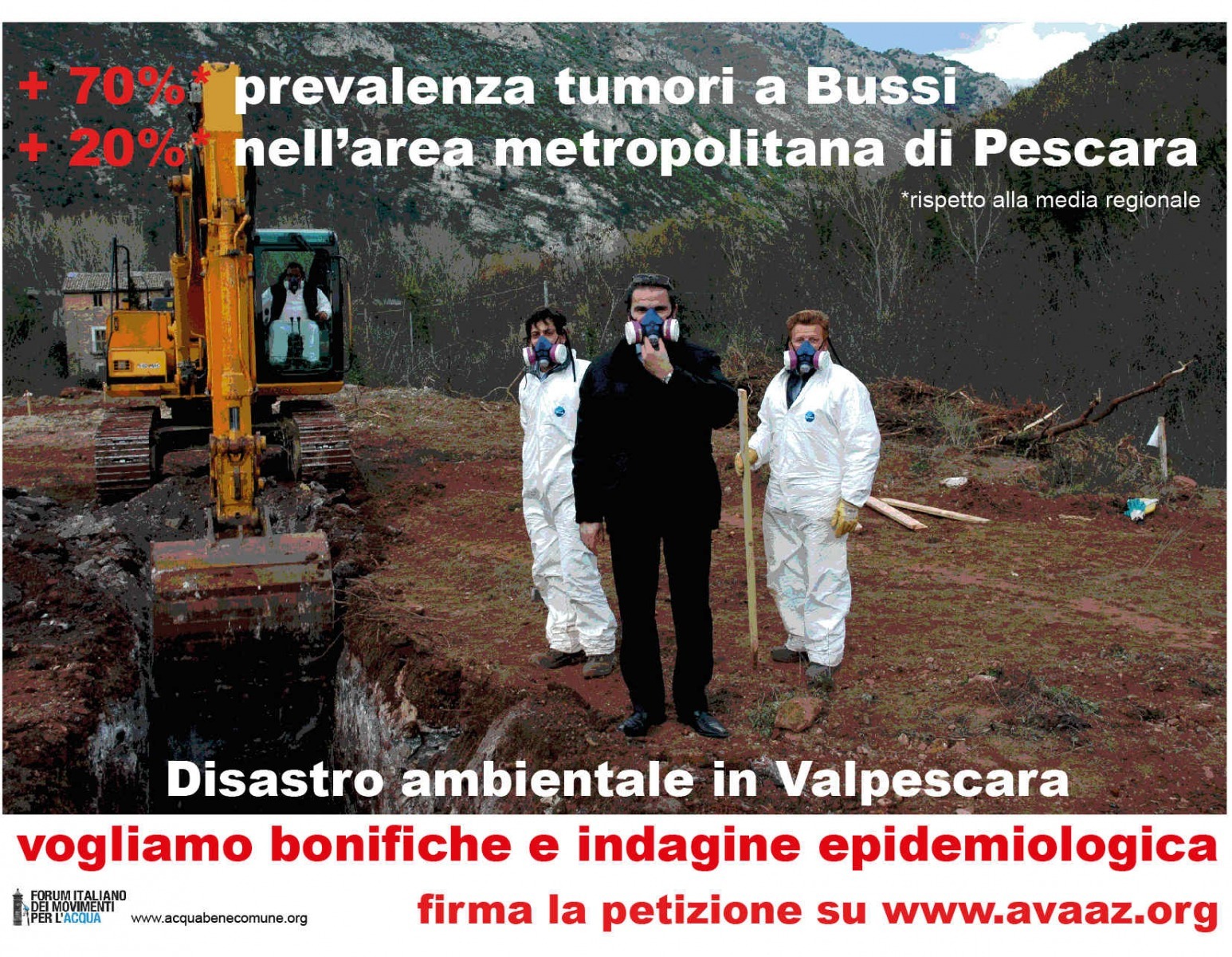 IN VALPESCARA CI SI AMMALA DI TUMORE. La questione del Registro dei Tumori, quello strumento dell'Agenzia Sanitaria Regionale che dà una mappa precisa della situazione della malattia, geolocalizzandone le caratteristiche, le specificità e l'incidenza, riapre ancora una volta la questione della bonifica del sito di Bussi. Secndo il commissario straordinario Goio servono almeno quaranta milioni di euro per mettere in sicurezza quell'area che continua ad avvelenare cielo, aria, terra ed acqua d'Abruzzo. A che punto siamo? Chi li deve mettere questi denari? Come è noto la questione giudiziaria è finita in un nulla di fatto perchè, appunto, il "fatto non sussiste" ovvero per la prescrizione di alcuni reati ambientali. La giustizia, dal punto di vista del ristoro dei danni verso quelli che si ritengono gli avvelenatori del nostro Abruzzo, sta andando avanti. Ma i tempi, come è noto, sono lunghissimi. Intanto che si fa? L'assessore regionale Mario Mazzocca è andato al Ministero dell'Ambiente per chiedere soldi allo Stato per fare partire questa procedura costosissima, ma per ora non si è mosso niente.