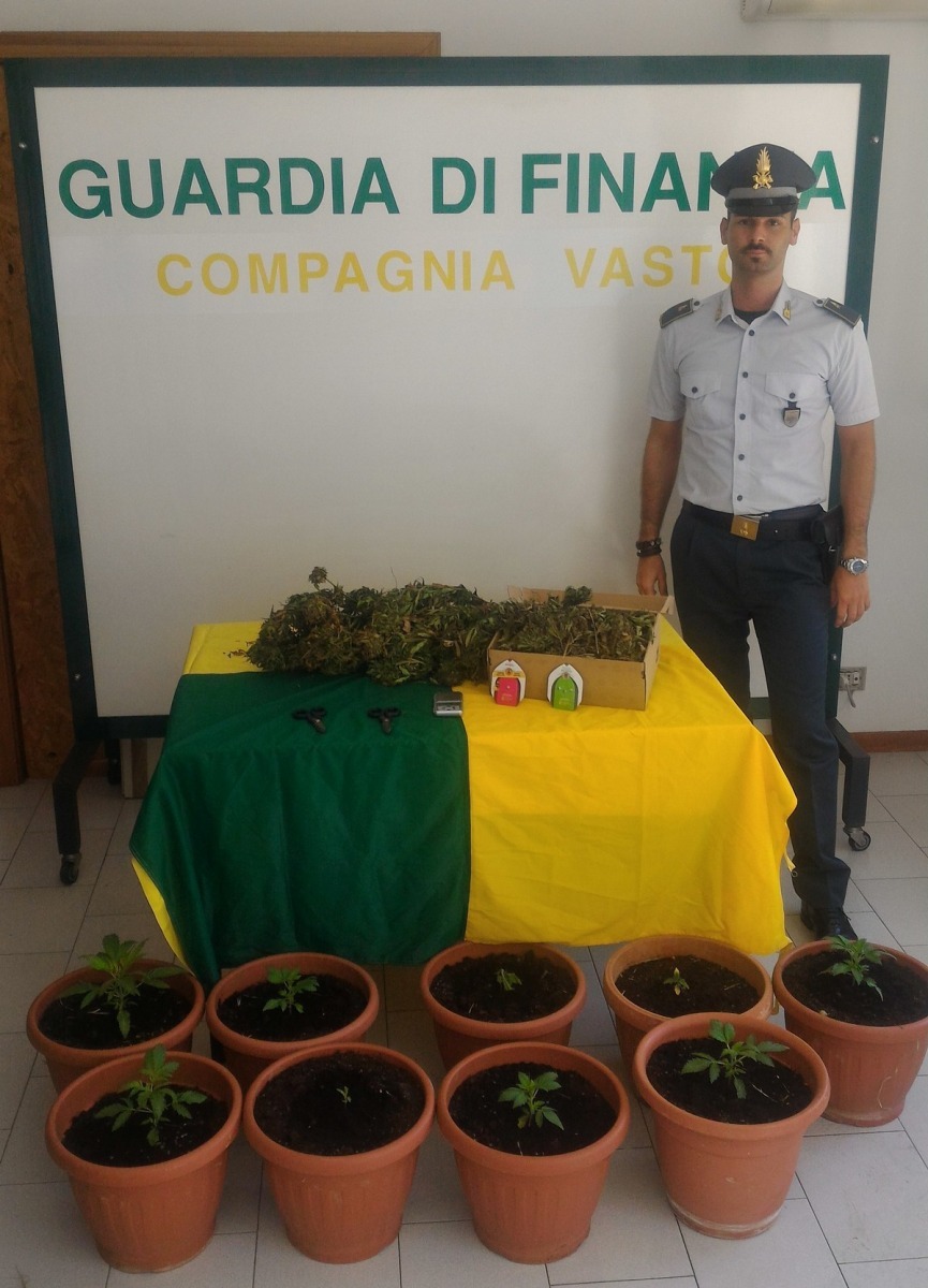 Da diverso tempo i militari della Compagnia della Guardia di Finanza di Vasto stavano monitorando le frequenti movimentazioni di persone che, con atteggiamenti furtivi, entravano e subito uscivano da una pineta antistante gli stabilimenti balneari della riviera di Torino di Sangro, località Le Morge. In particolare veniva individuata la assidua presenza di un soggetto, di nazionalità italiana, il quale, spostandosi a bordo di uno scooter e muovendosi con molta circospezione, si recava continuamente dalla Pineta alla propria abitazione e viceversa, lasciando presagire che potesse essere il corriere addetto alla cessione delle dosi di stupefacente. L’ipotesi è stata confermata nel corso della successiva, approfondita perquisizione condotta presso l’abitazione dello stesso, situata nella periferia vastese, dove i finanzieri hanno rinvenuto, abilmente occultata all’interno di una stanza adibita a magazzino, un bilancino di precisione digitale, materiale per il confezionamento ed una scatola di cartone contenente sostanza stupefacente di tipo marijuana già essiccata e pronta per essere immessa sul mercato illecito. All’esterno dell’abitazione, e precisamente nel terreno antistante, i militari hanno rinvenuto anche tredici piante di cannabis all’interno di vasi di terracotta. Dopo una attenta analisi si constatava che le piantine risultavano essere una potente varietà di canapa sativa in fioritura derivante dalla combinazione di diverse specie provenienti da svariate “scuole” di coltivatori di Cannabis del continente europeo. Il quantitativo complessivo di sostanza stupefacente sequestrata, pari a circa 1,8 kg, che sul mercato avrebbe fruttato circa 18.000,00 €, è stata inviata presso i Laboratori dell’ARTA di L’Aquila per le analisi quantitative e qualitative al fine di riscontrare il principio attivo. Il responsabile della coltivazione è stato tratto in arresto in violazione dell’art. 73 del D.P.R. 309/90 e condotto presso la Casa Circondariale di Vasto.