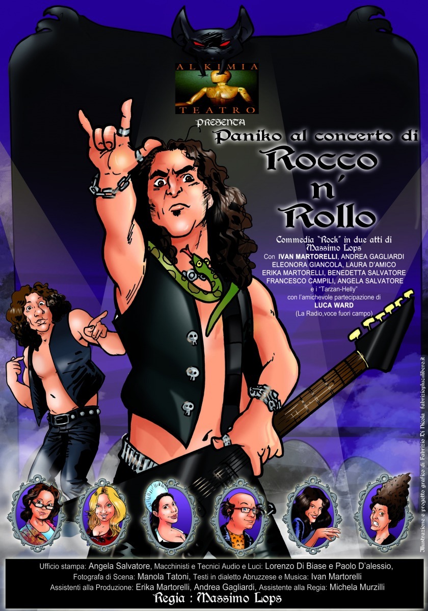 PANICO AL CONCERTO DI ROCCO 'N ROLLO - Mercoledì 4 luglio ore 21,30 all'Aurum di Pescara la commedia rock degli equivoci, ispirata alla "Chitarra del Gran Sasso" Rocco 'N Rollo. La produzione è dell'Alkimia Teatro e la regia è di Massimo Lops. Il cast è composto da ivan Martorelli, Andrea Gagliardi, Erika Martorelli,Eleonora Giancola, Laura D'Amico, Francesco Campili, Benedetta Salvatore e Angela salvatore. Partecipazione amichevole di Luca Ward (voce alla radio) . La Band : “Tarzan-Helly“