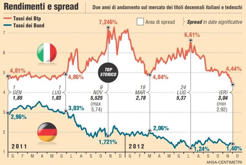 INCERTEZZA POLITICA. SALE LO SPREAD. I mercati non stanno a guardare. Anzi, le "incertezze" - specie quelle politiche - vengono viste molto male. Ed, infatti, è notizia di poco fa che la forbice tra il Bund tedesco ed i Btp italiani si è allargata a 330 punti base, col tasso sul decennale al 4,29%. Tradotto in termini di finanza pubblica: significa che il debito italiano aumenterà a causa della spesa per interessi. Che sia anche colpa dei rumors politici che dicono che Berlusconi potrebbe tornare in campo e candidarsi alle prossime elezioni politiche del 2013? «Costretto a tornare», aveva dichiarato meno di 24 ore fa l'ex presidente del Consiglio.