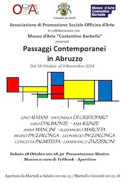 PASSAGGI CONTEMPORANEI IN ABRUZZO. Verrà inaugurata il 18 ottobre alle 18.30, e resterà aperta al pubblico fino al 9 novembre, la collettiva “Passaggi Contemporanei in Abruzzo” presso il Museo “Costantino Barbella” di Chieti. Ingresso libero.