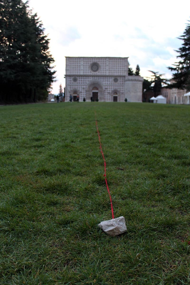 Collettiva perché, su invito di Marchegiani, altri due artisti hanno posizionato le proprie opere, contemporaneamente, nel centro storico dell’Aquila. Oltre a quelle dell’artista esplicitista, noto per i suoi blitz in tutta Italia, infatti, un lungo filo rosso con tanti nodi è stato posizionato nel piazzale della basilica di Collemaggio. L’idea è dell’artista Massimo Desiato, che vuole così rappresentare i tanti nodi ancora da sciogliere o i nodi della burocrazia italiana. In via San Bernardino, inoltre, è stata installata una riproduzione gigante dell’opera “Gli invisibili” di Fabiola Murri.