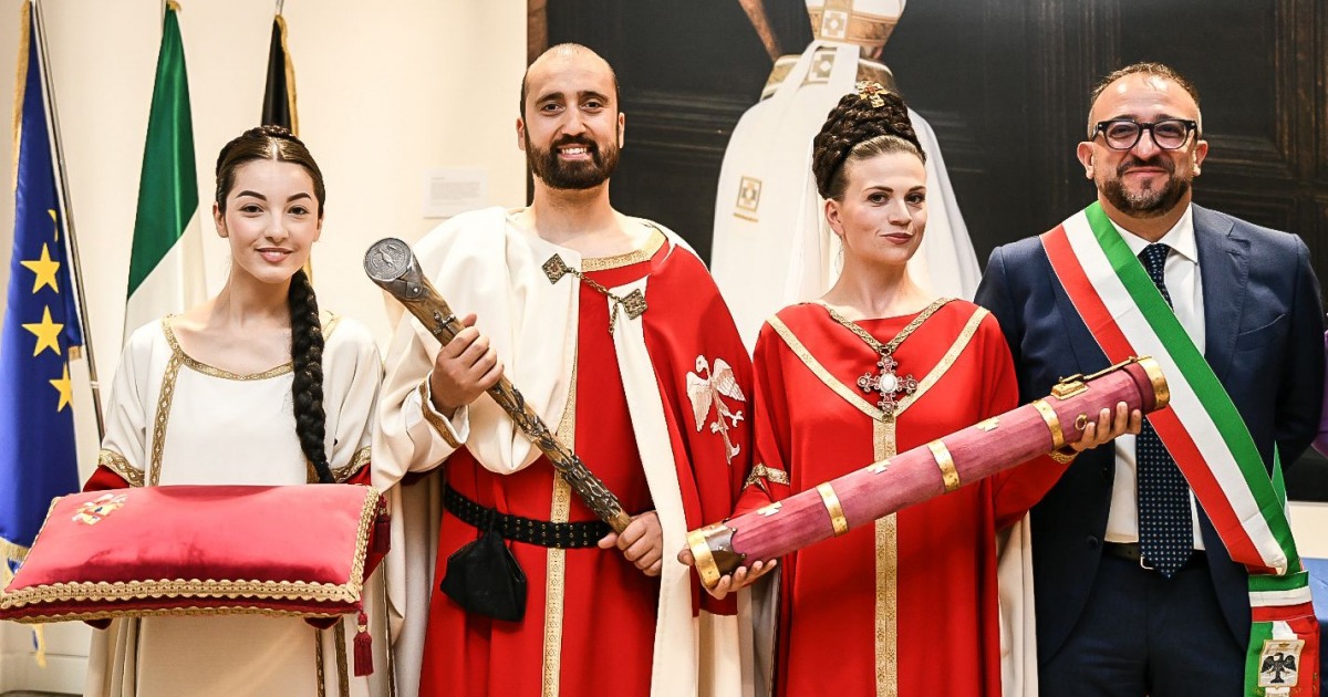 Si è svolta questa mattina all'Aquila la cerimonia di passaggio di consegne dei personaggi principali della 731ª Perdonanza Celestiniana. La Dama della Bolla, il Giovin Signore e la Dama della Croce dell'edizione 2024 hanno ceduto il testimone ai protagonisti del Corteo della Bolla 2025, in programma il 28 e 29 agosto.
