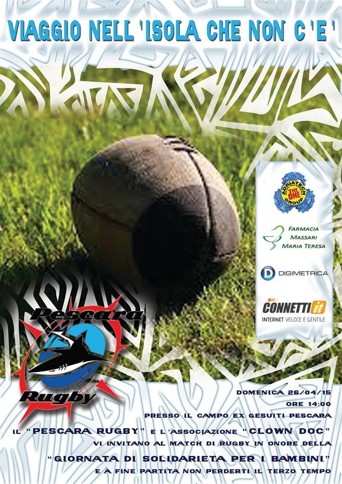 PESCARA RUGBY E CLOWNDOC ONLUS PESCARA PER IL PROGETTO “VIAGGIO ALL'ISOLA CHE NON C'E'”. Una partita speciale per vivere insieme una domenica all'insegna del divertimento e della solidarietà quella che si terrà domenica 26 aprile alle ore 14 presso l'impianto sportivo dei Gesuiti di Pescara in via Maestri del Lavoro.