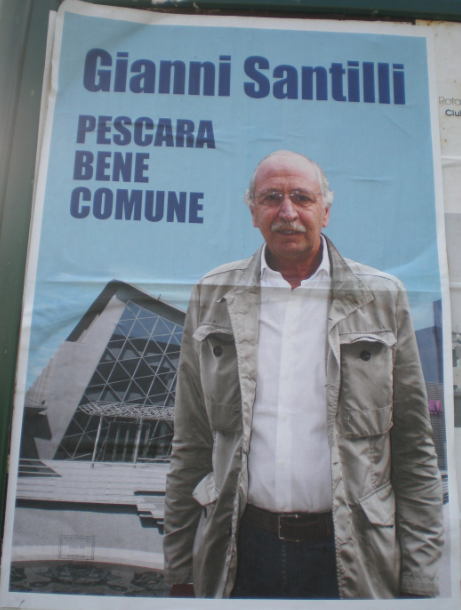 GIANNI SANTILLI: L'UOMO DEI MERCATINI. Ormai ribattezzato "l'uomo dei mercatini" (per la quantità industriale di fiere e mercatini organizzati da quando è entrato a far parte della squadra di Luigi il de-localizzatore), il buon Santilli si è mosso per tempo iniziando sin da ora a tappezzare la città di manifesti "pubblicitari" dove campeggia la sua figura, con abiti rigorosamente casual e la scritta "Pescara bene comune" che fa tanto figo al giorno d'oggi. Dietro di lui, la facciata del nuovo mercato di piazza Muzii così come apparirà una volta terminata la sua riqualificazione. Bravo, Gianni! Complimenti vivissimi per la lungimiranza.