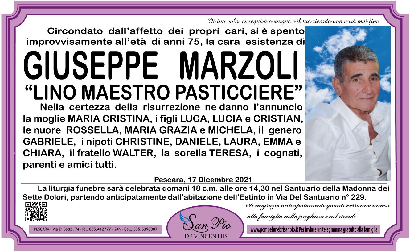 Si è spento ieri sera nella sua abitazione in via Del Santuario all'età di 75 anni il maestro pasticcere Giuseppe Marzoli. Lino, come era conosciuto da amici e clienti, se ne è andato improvvisamente a pochi giorni dal suo 76esimo compleanno. Nato nel 1945 nel giorno di Natale a Pescara, all'età di 14 anni, raccogliendo la passione di mamma Lucia e papà Giuseppe, decide di aprire la sua attività, a Piazza Sacro Cuore, 'La casa della torta' dove sfornava quotidianamente bombe e cornetti.