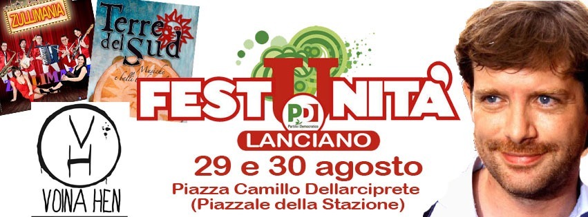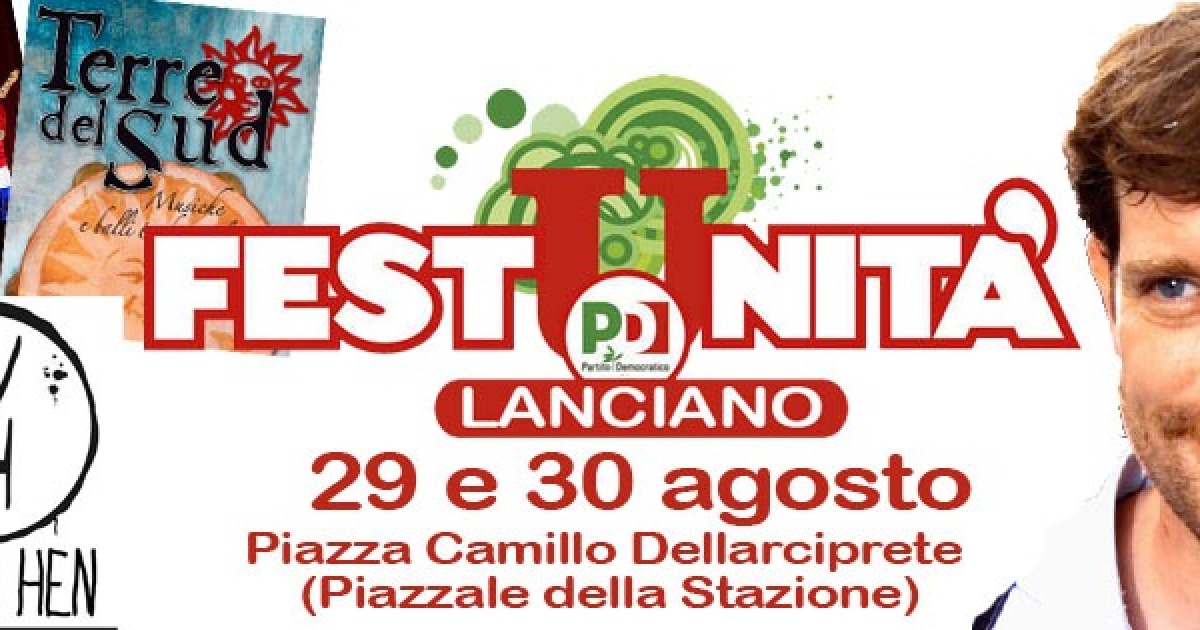 CI SARANNO ANCHE LEGNINI E IL FARAONE. La manifestazione si chiuderà sabato 30 con gli interventi del sottosegretario Giovanni Legnini, del governatore Luciano "Faraone" D'Alfonso e dell'on. Maria Amato. Ci saranno anche Chiara Zappalorto, segretaria provinciale del Pd, e Leo Marongiu, segretario cittadino del Pd. Prevista anche la presenza dell'assessore regionale Silvio Paolucci; a seguire tanta musica con i Voina Hen, le Terre Del Sud e Zullimania. Alla due giorni prenderano inoltre parte il sindaco di Lanciano Mario Pupillo e tutti gli iscritti e simpatizzanti del locale Partito Democratico. La kermesse avrà poi momenti di musica e gastronomia.