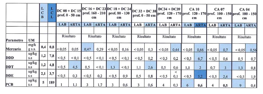 INQUINANTI IN VASCA COLMATA E DARSENA. Per quanto riguarda i risultati dei dati chimico fisici. Materiali in cassa di colmata: sia nella analisi dell'Arta che nei 129 campioni della ditta incaricata dalla Sidra sono stati rilevati valori che superano i limiti per il parametro "idrocarburi pesanti". Per quanto riguarda i sedimenti portuali, invece, c'è la discordanza tra i dati Sidra e quelli di Arta (vedere tabella).