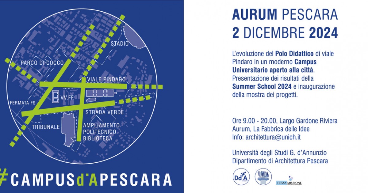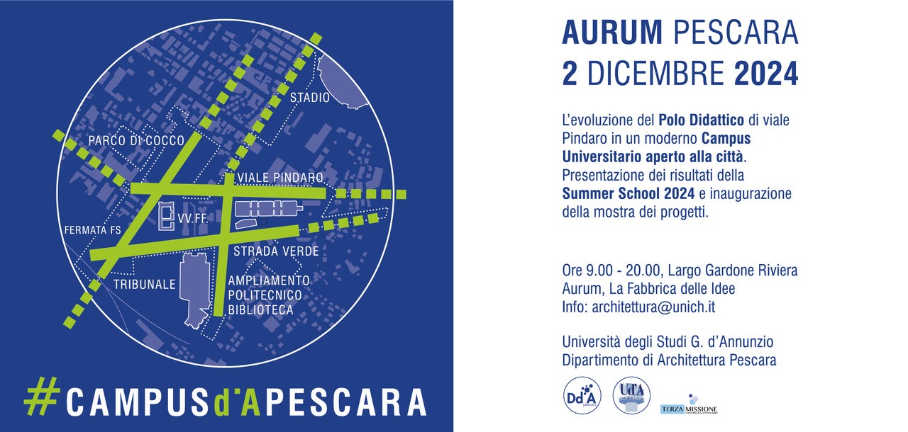 Il prossimo 2 dicembre, presso l'ex-Aurum di Pescara, verranno presentati i risultati della “Summer School 2024” del Dipartimento di Architettura dell’Università “Gabriele d’Annunzio”, un workshop progettuale di 12 giorni full immersion che quest’anno è coinciso con i Blended Intensive Programme (BIP) e ha visto la partecipazione di 200 studenti provenienti da 15 Atenei di 12 Paesi europei. Oggetto dell’esercitazione progettuale è stato il Master Plan di ampliamento del Campus di Pescara, che interessa aree di proprietà pubblica che si affacciano su viale Pindaro. La giornata si articolerà in due momenti, ambedue aperti al pubblico: la sessione mattutina sarà dedicata alla presentazione istituzionale del Masterplan e all’inaugurazione della mostra, mentre il pomeriggio ci saranno i tavoli di co-progettazione con gli stakeholder per la raccolta di idee e proposte per continuare la metodologia di partecipazione e coinvolgimento dei portatori di interesse locali.