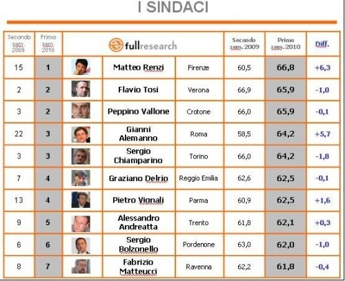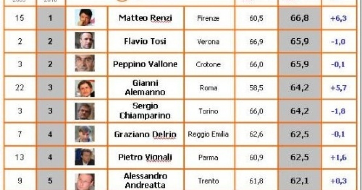 Pubblicata classifica dei Primi cittadini più amati d'Italia