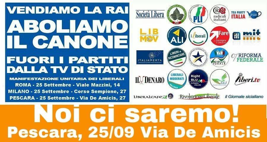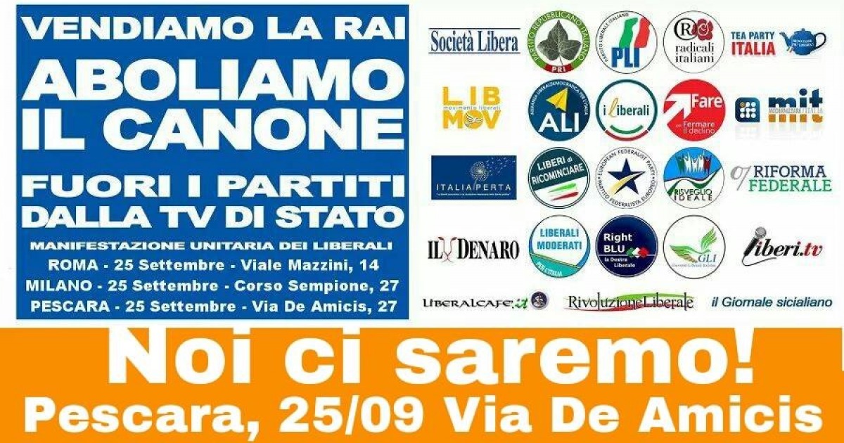 VENDIAMO LA RAI. In contemporanea con le città di Roma e Milano, i Liberali hanno organizzato a Pescara la manifestazione unitaria chiamata “Vendiamo la Rai, fuori i partiti dalla tv di Stato”. Il presidio si terrà giovedì 25 settembre, dalle ore 18 alle ore 20, davanti alla sede regionale della Rai in via De Amicis 27, a Pescara.