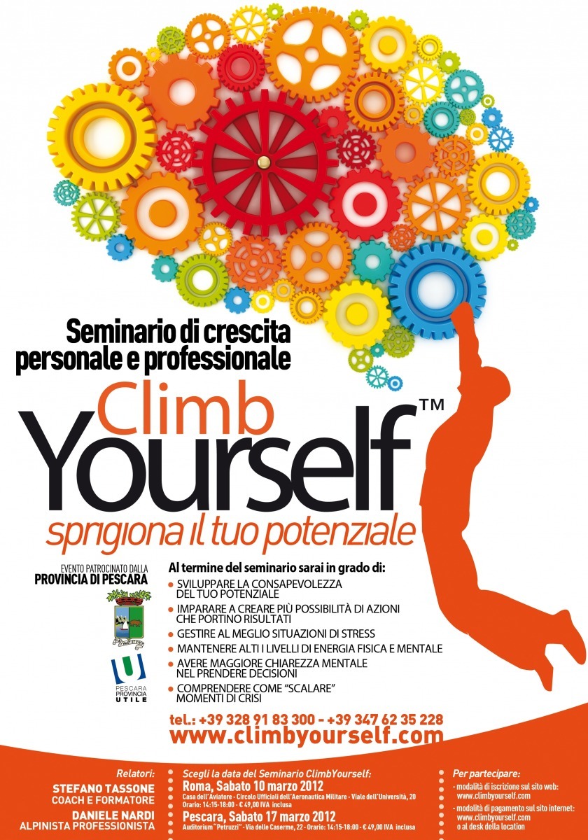 CLIMBYOURSELF - Raccogliere risultati impensabili sfruttando le proprie capacità innate, sprigionare il proprio potenziale, anche in condizioni di stress. Superare difficoltà che a prima vista appaiono insormontabili è come scalare montagne. Questo è il nuovo stimolante progetto portato avanti dallo scalatore Daniele Nardi e da Stefano Tassone, ex atleta centometrista e duecentometista, oltre che uno dei coach più noti nel panorama italiano. L’ambizione del progetto ClimbYourself è chiara e al tempo stesso affascinante: aiutare le persone a scalare le difficoltà di tutti i giorni sia in campo lavorativo che personale in un'Italia che oggi richiede il massimo da ognuno di noi.