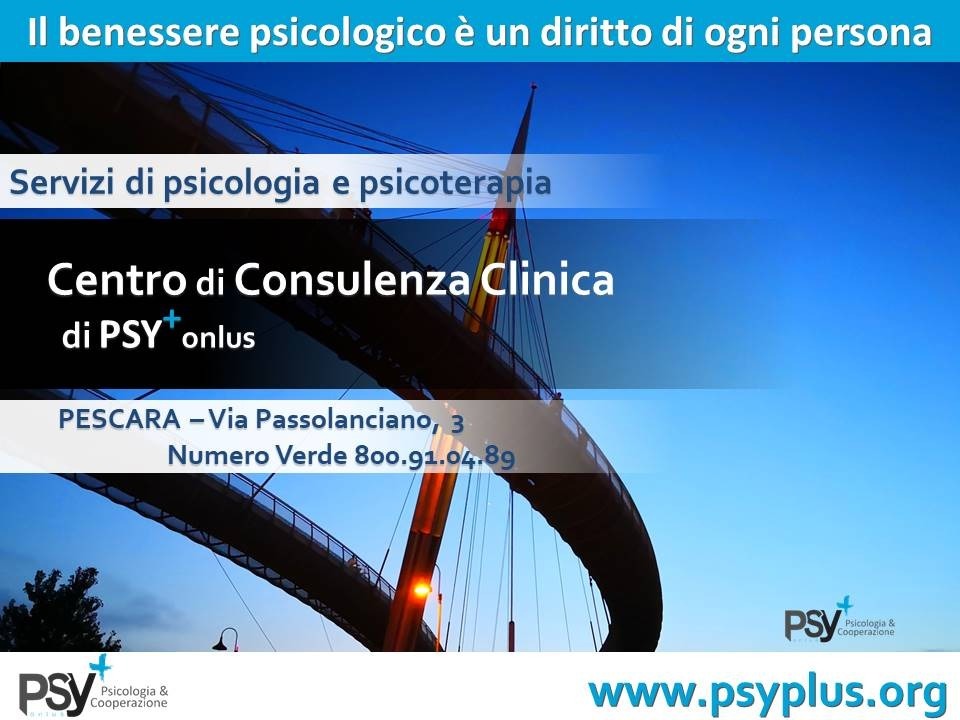 PSY+ ONLUS INAUGURA IL CENTRO DI CONSULENZA CLINICA A PESCARA. Sabato 6 luglio alle ore 18 si terrà a Pescara, in Via Passolanciano n. 3, angolo Via del Circuito, l'inaugurazione del Centro di Consulenza Clinica di Psy+ Onlus, da anni impegnata nella promozione del benessere psicologico su territorio nazionale. Dopo Roma, anche Pescara ospiterà una sede della Onlus, che vedrà nel Centro di Consulenza Clinica il primo di una serie di progetti pensati appositamente per rispondere agli specifici bisogni del territorio pescarese. Con questa attività, in particolare, si intende favorire l'accesso a servizi di psicologia e psicoterapia di elevata professionalità anche alle persone che presentano una condizione socio-economica svantaggiata, grazie a tariffe sostenibili. L'équipe è composta da psicologi e psicoterapeuti, soci pescaresi di Psy+. I servizi psicologici erogati presso il Centro di Consulenza Clinica sono molteplici e vanno dalla psicoterapia individuale a quella di coppia e familiare, dalla presa in carico di minori alla valutazione psicodiagnostica. E' possibile accedere al servizio chiamando il numero verde 800.91.04.89. Per maggiori informazioni è possibile visitare il sito di Psy+ Onlus www.psyplus.org. Il benessere psicologico è un diritto di ogni persona!