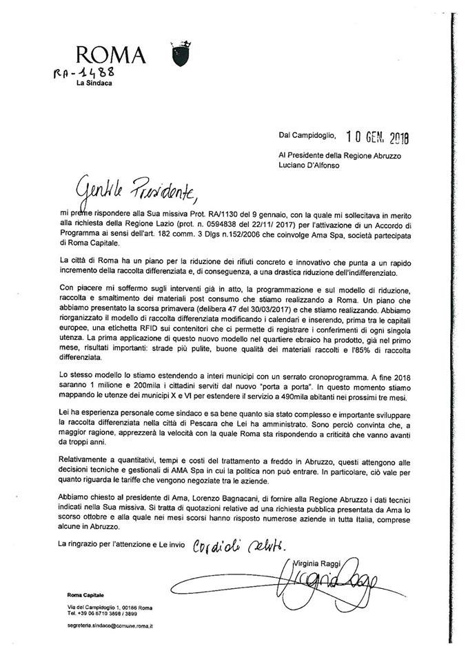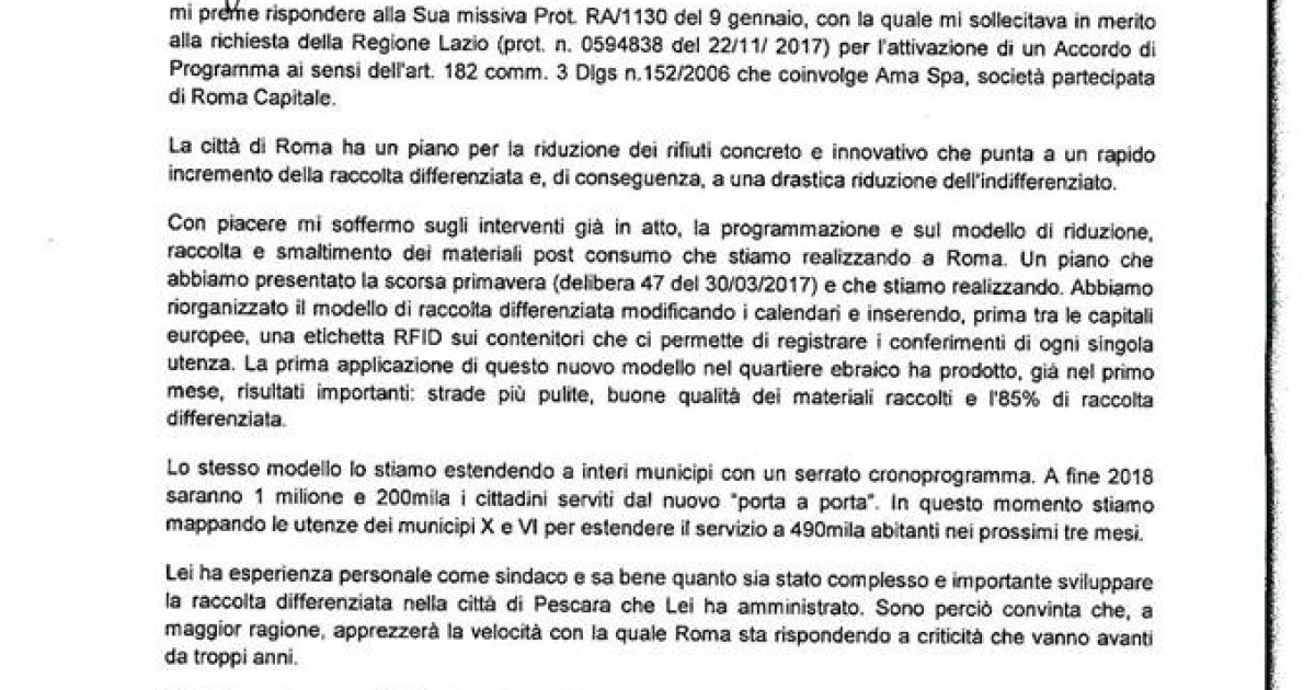 CASO RIFIUTI IL SINDACO DI ROMA RISPONDE ALLA LETTERA DELL'ABRUZZO. il sindaco di Roma Virginia Raggi ha risposto alla lettera inviata ieri dal Governatore Luciano D'Alfonso attraverso un lungo post facebook. L'argomento è, ovviamente, la questione dell'immonizia della Capitale d'Italia e che, stando alle parole del primo cittadino capitolino, è in via di risoluzione. "Facciamo chiarezza sui rifiuti", dice Virginia Raggi nell'incipit: "dal 2013 - anno di chiusura della discarica di Malagrotta con il Pd che aveva al governo Letta-Renzi, in Regione Zingaretti e al Comune Marino e si “dimenticò” di pianificare una alternativa - il piano regionale del Lazio non è stato ancora aggiornato: di conseguenza, la Regione dichiara di non riuscire ad accogliere le tonnellate di indifferenziato prodotte da cittadini e imprese. Al momento - prosegue la sindaca - Roma raccoglie i propri rifiuti e prova a conferirli nelle poche strutture della Regione che, però, pare che siano insufficienti. Si tratta in tal caso di un sistema fragile che stiamo rendendo forte e stabile con la richiesta di autorizzazioni per costruire impianti di compostaggio e di riciclo; con l’estensione della raccolta differenziata spinta a oltre 1 milione di abitanti nel 2018". E poi: "Da anni sappiamo che il ciclo dei rifiuti registra una sovrapproduzione: a Natale, Pasqua e a luglio durante la manutenzione degli impianti. Per questo lo scorso 22 ottobre Ama, in vista del picco di produzione dei rifiuti a Natale, l’azienda partecipata di Roma che raccoglie i rifiuti ha chiesto alla Regione Lazio l’autorizzazione a conferire al di fuori della regione. Zingaretti - precisa l'avvocato romano- ha sbloccato la richiesta soltanto dopo un mese: gli uffici regionali hanno giustificato il ritardo con un “mancato funzionamento del sistema informatico”. Quindi un asserito guasto dei pc della Regione avrebbe messo in crisi il sistema Regionale creando difficoltà a milioni di romani. A quel punto senza sollevare alcuna polemica (ma inviando con una nota di sollecito alla Regione) abbiamo iniziato a lavorare in silenzio all’individuazione di soluzioni alternative pensando al bene dei romani". Ma come è stata affrontata l'emergenza riportata dai media? "Ieri - puntualizza l'eponente del Movimento 5 stelle - Ama ha sottoscritto un accordo con un’azienda laziale che consente sia di contribuire a rinforzare il sistema di smaltimento di Ama, sia di superare le criticità legate alla sovrapproduzione di rifiuti del periodo natalizio (più consumi determinano più rifiuti). Gli accordi di Ama con altre aziende - conferma la Raggi - servono proprio a superare il deficit infrastrutturale della Regione Lazio. Noi diciamo no a chi vuole speculare - politicamente ed economicamente - sulle spalle dei cittadini, magari proponendo tariffe fuori mercato per mettere in difficoltà le amministrazioni e gli abitanti di Roma". E l'Abruzzo quindi che farà? "Ho risposto al governatore della Regione Abruzzo, che ha offerto la propria disponibilità ad accogliere i rifiuti della Regione Lazio, e l’ho tranquillizzato sulla validità del Piano per la gestione dei materiali post consumo che abbiamo approvato lo scorso marzo e che contribuirà alla drastica riduzione dei rifiuti indifferenziati". Insomma, non è chiaro se nei nostri impianti autorizzati verranno trattati i rifiuti capitolini ed in quanta parte finirà in discarica. Al momento, secondo noi, gli interrogativi restano tutti.