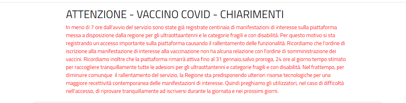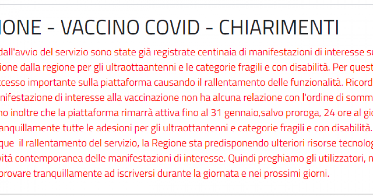 “Ricordiamo – si continua a leggere nella nota- che l’ordine di iscrizione alla manifestazione di interesse alla vaccinazione non ha alcuna relazione con l’ordine di somministrazione dei vaccini. Ricordiamo inoltre che la piattaforma rimarrà attiva fino al 31 gennaio, salvo proroga, 24 ore al giorno tempo stimato per raccogliere tranquillamente tutte le adesioni per gli ultraottantenni e categorie fragili e con disabilità. Nel frattempo, per diminuire comunque il rallentamento del servizio, la Regione sta predisponendo ulteriori risorse tecnologiche per una maggiore recettività contemporanea delle manifestazioni di interesse. Quindi preghiamo gli utilizzatori, nel caso di difficoltà nell’accesso, di riprovare tranquillamente a iscriversi durante la giornata e nei prossimi giorni“.