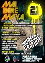 A MONTESILVANO IL FESTIVAL "MAI DIRE MAYA". L’evento più originale dell'anno voluto dal sindaco "stelle e strisce, amante della cultura hip hop e del rap, Attilio Di Mattia (feat. Comune di Montesilvano), non poteva che essere per il fatidico 21 dicembre . venerdì!- profezia dei Maya permettendo. Sul Palaroma di Montesilvano la crème della scena rap pescarese espansa, e non solo, per il festival "Mai dire Maya!".