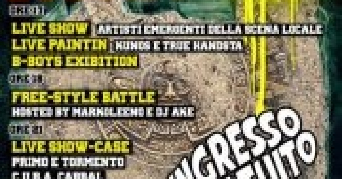 GLI ARTISTI IN CAMPO. Nel mega-live, a partire dalle ore 21, si esibiranno in ordine sparso PRIMO & TORMENTO, C.U.B.A. CABBAL, TEK MONEY, JOSAGUN + DJ DELI, CARICHE ESPLOSIVE, e BAYESHAN, icona dell’hip-hop demenziale impegnato. AFTER SHOW con dj-set by MARKOLEENO + GIANLUCA G. Nel pomeriggio, invece, dalle 17, live showcase con artisti emergenti della scena rap locale, b-boys exibition, aerosol art performance e free-style battle. Ingresso gratuito.