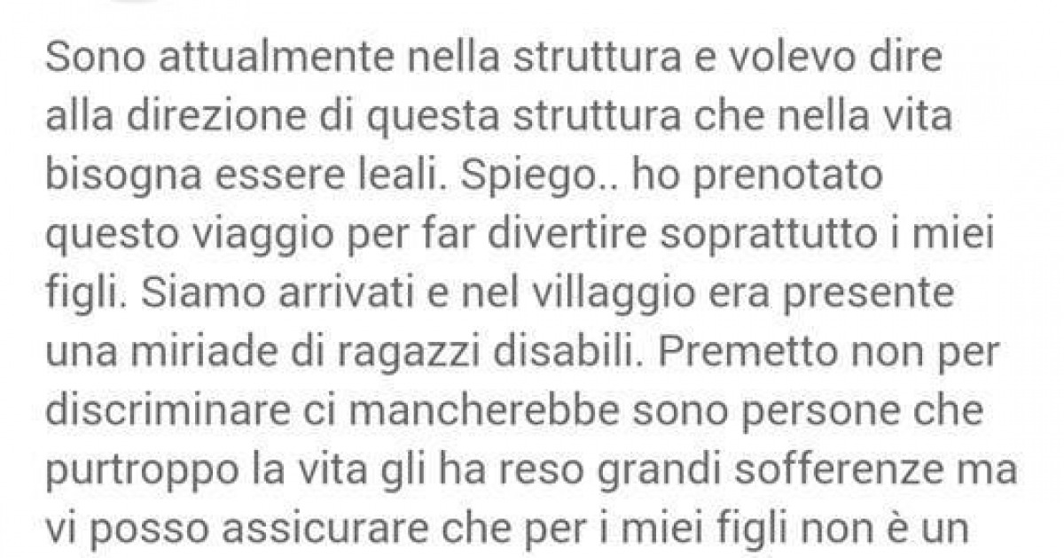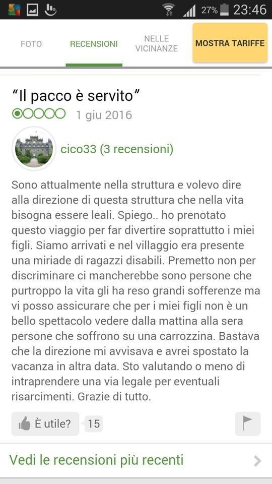 UOMO RECENSISCE NEGATIVAMENTE E MINACCIA LE VIE LEGALI PER UNA VACANZA CON "TROPPI DISABILI". "A proposito di Tripadvisor e di quello che l'imbecille di turno è autorizzato a postare, ecco qui una recensione del primo giugno 2016. Il gentile signore è in vacanza con la famiglia nel villaggio turistico Lido d'Abruzzo a Roseto degli Abruzzi e poverino, ha intenzione di denunciare la struttura perchè c'erano troppi disabili. E poverini, i figli sono rimasti impressionati. Mica da un padre così, no, da due carrozzine". Queste le parole della giornalista Selvaggia Lucarelli - che condividiamo completamente - a commento del post dall'inquietante dal titolo "Il pacco è servito..." scritto sulla pagina "Tripadvisor" dell'Hotel Lido D'Abruzzo di Roseto degli Abruzzi che sta facendo indignare la nostra regione e non solo. Massima solidarietà alla direzione dell'hotel accessibile mentre stigmatiziamo, lo ripeteremo fino alla morte, chi discrimina i disabili e non rispetta i diritti umani.