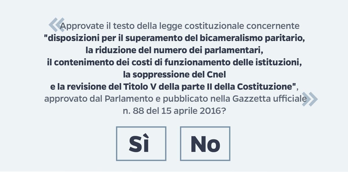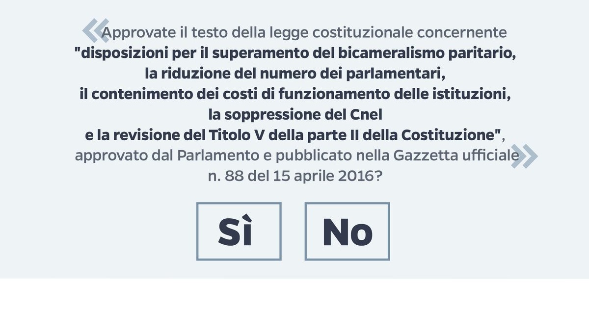 «Approvate il testo della legge costituzionale concernente “disposizioni per il superamento del bicameralismo paritario, la riduzione del numero dei parlamentari, il contenimento dei costi di funzionamento delle istituzioni, la soppressione del Cnel e la revisione del Titolo V della parte II della Costituzione”, approvato dal Parlamento e pubblicato nella Gazzetta ufficiale n. 88 del 15 aprile 2016?».