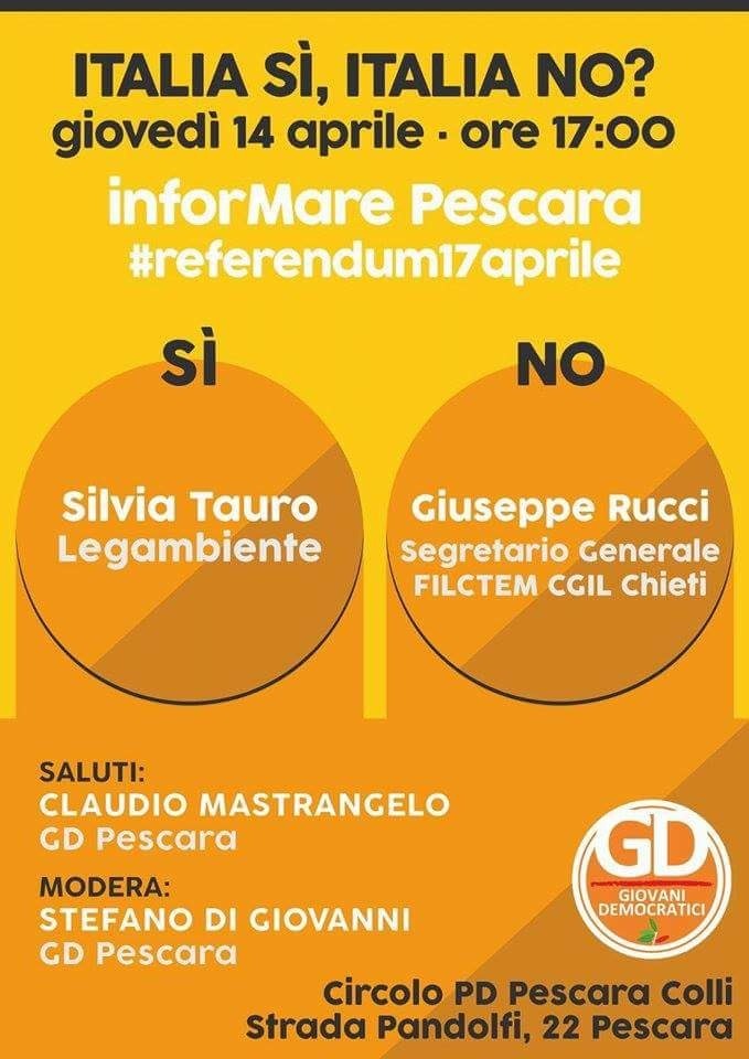 VERSO IL REFERENDUM. I Giovani Democratici di Pescara organizzano per giovedì 14 aprile, alle ore 17 presso il circolo PD Pescara Colli, in Strada Pandolfi 22, l'iniziativa "Italia Sì, Italia No? InforMare Pescara" di sensibilizzazione in vista del referendum abrogativo sulle trivelle in programma per il prossimo 17 aprile.