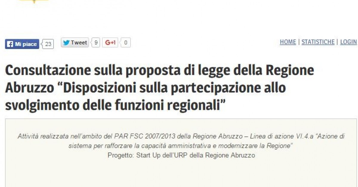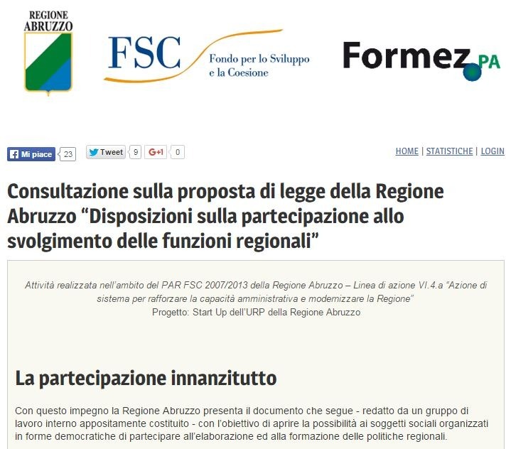 LA REGIONE ABRUZZO "VARA" LA PIATTAFORMA ONLINE PER FARE LE LEGGI REGIONALI. La Regione Abruzzo e' la prima Regione d'Italia a sperimentare, per la legge sulla partecipazione democratica, una piattaforma on-line (gestita dal Formez) dove si possono dare suggerimenti, avanzare proposte e fare commenti al testo di legge. L'obiettivo, dunque, e' quello di coinvolgere i soggetti sociali, organizzati in forme democratiche, nell'elaborazione e nella formazione delle politiche regionali come ha spiegato il sottosegretario Mario Mazzocca intervenuto oggi all'evento di presentazione della bozza di legge dal titolo "Disposizioni sulla partecipazione allo svolgimento delle funzioni regionali". Sono intervenuti anche il Direttore generale Cristina Gerardis e il Capo Dipartimento Tommaso Di Rino. Gli utenti possono aderire alla Consultazione pubblica su "La Partecipazione innanzitutto" attraverso la piattaforma gestita dal Formez al seguente link :http://commenta.formez.it/ch/Partecipazione_Abruzzo. La finalita' della redigenda legge e' quella di prevedere ambiti e modalita' di intervento in cui esercitare il diritto alla partecipazione sugli atti normativi e sugli atti di programmazione e pianificazione.