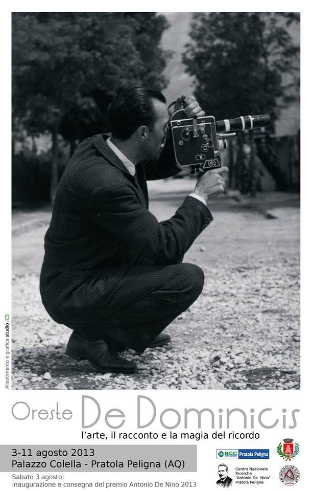 "L'ARTE, IL RACCONTO E LA MAGIA DEL RICORDO": RETROSPETTIVA DEL FOTOGRAFO DE DOMINICIS. Sabato 3 agosto, alle ore 18:00, nei locali il Palazzo Colella a Pratola Peligna verrà inaugurata la mostra "Oreste De Dominicis, l'arte, il racconto e la magia del ricordo" dedicata al lavoro fotografico e figurativo dell'artista pratolano. Nel corso dell'inaugurazione verrà consegnato al fotografo l'edizione 2013 del premio "Antonio De Nino" istituito dal Centro Nazionale Ricerche "Antonio De Nino".