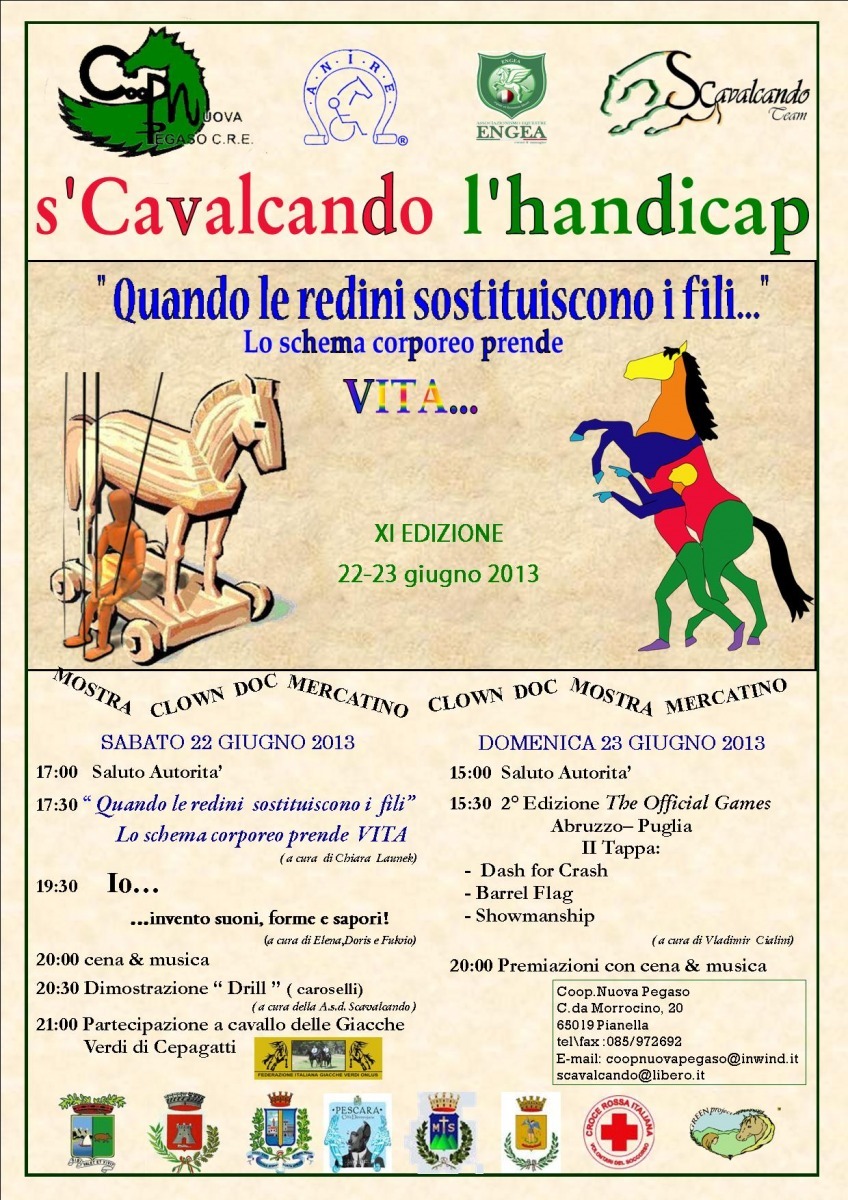 PIANELLA. S'CAVALCANDO L'HANDICAP. La Coop. Nuova Pegaso, da anni impegnata nel settore socio\sanitario della Riabilitazione Equestre, ha organizzato insieme alla A.s.d. Scavalcando la Manifestazione “S’Cavalcando l’handicap” giunta oramai alla sua XI edizione. L'appuntamento è per il prossimo 22 giugno quando, a partire dalle ore 17:00, si aprirà il saggio con uno spettacolo a cavallo cosiddetto “Quando le redini sostituiscono i fili … lo schema corporeo prende VITA”, lavoro programmato dall’equipe. A seguire i ragazzi del Laboratorio Bio-Eco- Music faranno una dimostrazione musicale e ci sarà una mostra \mercato del lavoro svolto durante l’anno. La serata continuerà con festa, caroselli a cavallo a cui parteciperanno anche le Giacche Verdi di Cepagatti, con i loro Murgesi, ed il team dei Clown Doc. La manifestazione sarà aperta dal saluto delle Autorità del Territorio che hanno patrocinato l’evento.