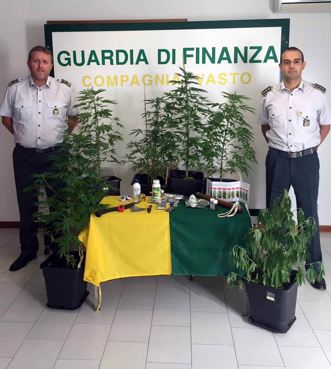 SAN SALVO: COLTIVAVA MARIJUANA SUL BALCONE DI CASA, DENUNCIATO INSIEME AL 'PALO': Un ragazzo di San Salvo ed il suo amico, indicato dagli inquirenti come 'palo, sono stati denunciati alla Procura della Repubblica di Vasto con l'accusa di detenzione ai fini di spaccio di sostanze stupefacenti. Il blitz dei Baschi Verdi della Finanza è scattato dopo aver notato strani movimenti sotto l'abitazione nel centro cittadino di San Salvo. Così dopo alcuni giorni di appostamento è scattata la perquisizione nell'abitazione per scoprire una piantagione di marijuana “fai da te”, 6 piante di cannabis indica, con altezza superiore agli 80 cm, nonché materiale di concimazione e diversi attrezzi agricoli, utilizzati per l’illecita coltivazione. Nell'abitazione c'erano anche 32 gr. di hashish, due apparecchi per tritare la marijuana, due bilancini di precisione e un’ascia di acciaio con impugnatura in plastica, quest’ultima nascosta nella vaschetta dello scarico del water.