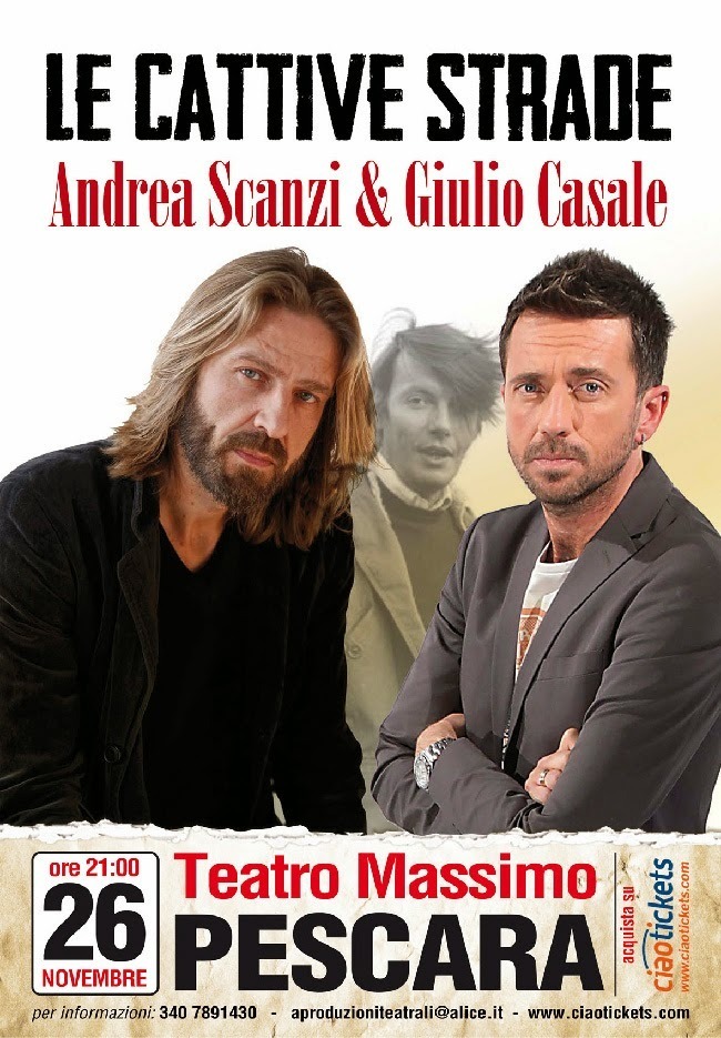 LE"CATTIVE STRADE" DOMANI A PESCARA. Andrea Scanzi, giornalista, autore teatrale e scrittore, racconta gli snodi del percorso artistico del poeta e cantautore ligure Fabrizio De Andrè. Alla sua narrazione si alternano le interpretazioni del cantautore e attore Giulio Casale, capace di personalizzare con rispetto, personalità ed eclettismo il repertorio di Faber. Il lavoro, che racconta anche il De André meno noto, non desidera canonizzare o - peggio ancora - santificare l'artista. Al contrario, 'Le Cattive strade' intende raccontare, senza agiografie ma con passione, le continue rivoluzioni e le poderose intuizioni (anche musicali) di un intellettuale inquieto. Scomodo. Irripetibile.