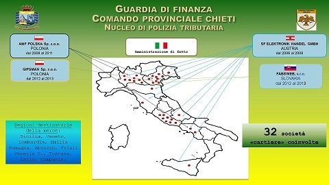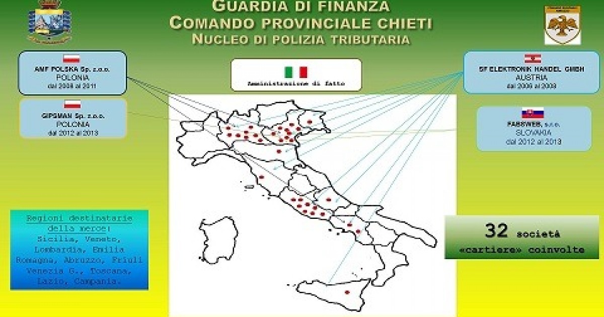 IL MECCANISMO FRAUDOLENTO. Il meccanismo della frode si è basato su operazioni intercorse tra soggetti con sede in diversi paesi membri della Comunità Europea e volte ad aggirare la normativa sul regime IVA degli acquisti intracomunitari. In particolare, la merce veniva acquistata in esenzione d’imposta da soggetti giuridici esteri la cui localizzazione all’estero (Austria, Polonia e Slovacchia) è risultata fittizia in quanto la loro l’attività si realizzava di fatto in Italia (Francavilla al Mare, Ripa Teatina e Pescara), e successivamente rivenduti ad acquirenti finali nazionali, interponendo soggetti giuridici nazionali (c.d. società cartiera o missing trader) creati ad hoc al solo scopo di caricarsi di tutto il debito IVA che non sarebbe mai stato pagato.