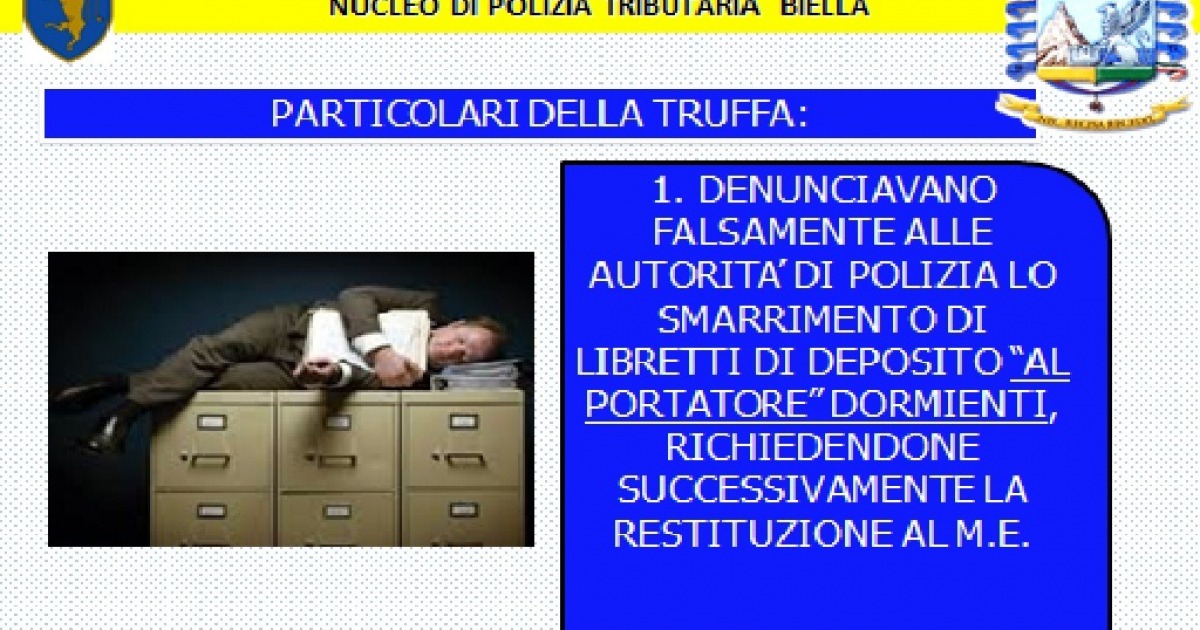 “TOTO’ TRUFFA”: un avvocato e un commercialista di origine campana sono gli ideatori della frode scoperta e denominata così dalle Fiamme Gialle del Nucleo di Polizia Tributaria di Biella che ha riguardato prelievi illeciti su conti correnti e libretti di risparmio cosiddetti “dormienti” per un ammontare complessivo di circa due milioni di euro.