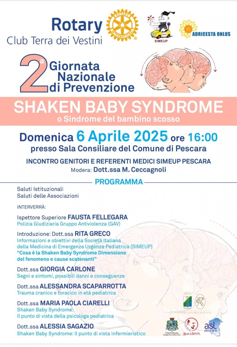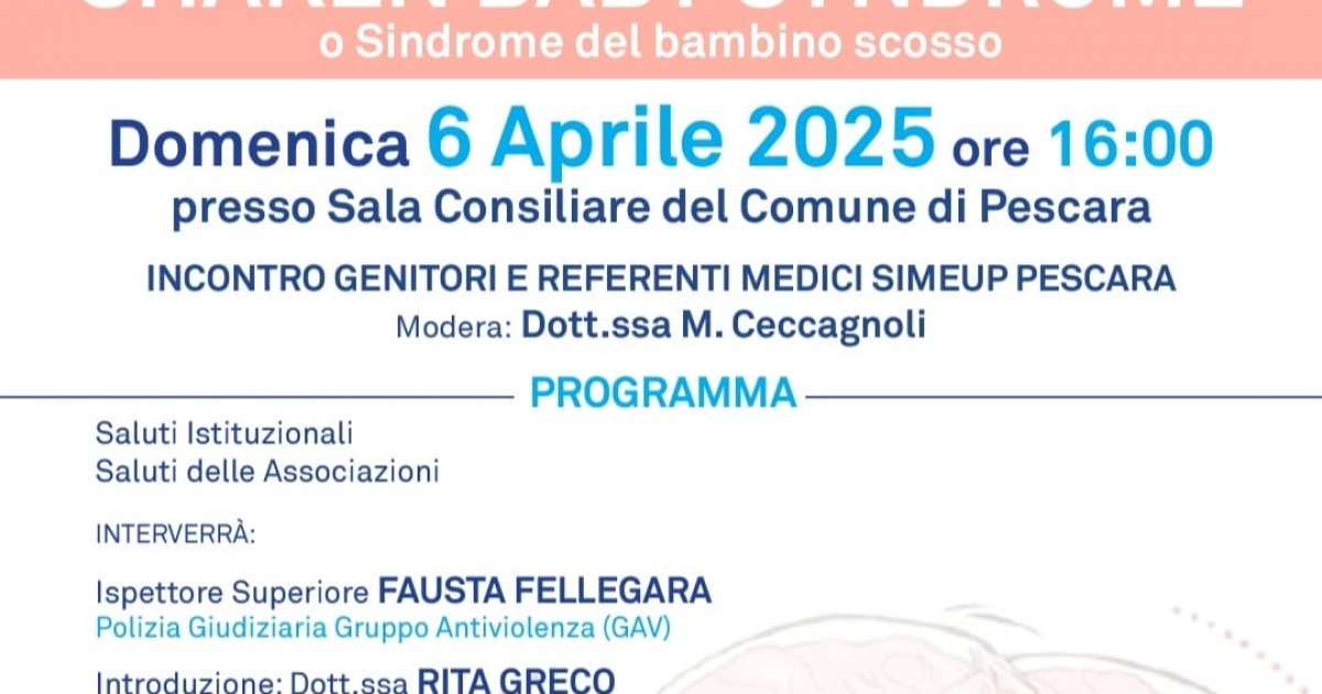 Tale contatto può provocare un trauma cranico, compreso un ematoma subdurale, una lesione assonale diffusa e un’emorragia retinica. Il tasso annuale stimato di lesioni cerebrali traumatiche inflitte è di 30 casi ogni 100.000 bambini di età inferiore a 1 anno che giungono presso i Pronto Soccorso Pediatrici. Come afferma la Dott.ssa Rita Greco Medico Pediatra e Vice Presidente Regionale SIMEUP Abruzzo: "Il trauma cranico non accidentale nei neonati è la principale causa di morte infantile per lesioni. Le caratteristiche cliniche che suggeriscono un trauma cranico (noto anche come sindrome del bambino scosso o sindrome da impatto scosso) includono la triade composta da emorragia retinica, emorragia subdurale e/o subaracnoidea in un neonato con piccoli segni di trauma esterno. Le lesioni violente alla testa sono tra le cause più comuni di lesioni gravi e letali nei bambini" Queste lesioni possono derivare da urti, scosse o da una combinazione di questi meccanismi che fanno sì che la testa del bambino subisca movimenti di accelerazione/decelerazione, che possono creare un movimento inerziale del cervello all’interno del compartimento cranico con importanti conseguenze. L'evento è organizzato dal Rotary Club Terra dei Vestini, Simeup e Adrigesta Onlus. Interverranno Fausta Fellegara (Polizia Giudiziaria Gruppo Antiviolenza), Rita Greco, le dottoressa Giorgia Carlone, Alessandra Scaparrotta, Maria Paola Ciarelli e Alessia Sagazio.